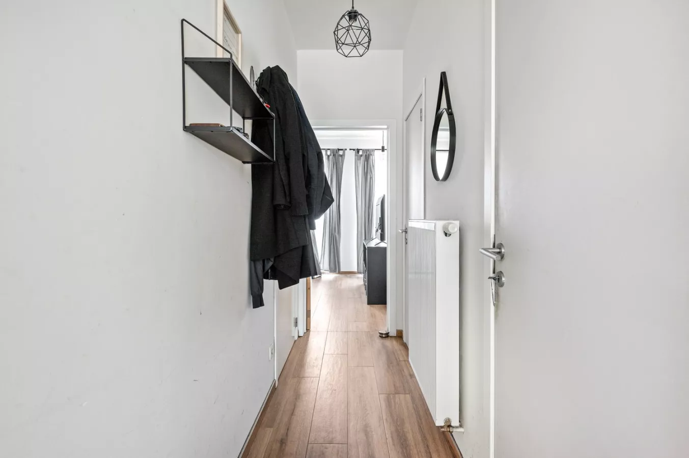 U betreedt het appartement via een inkomhal en komt vervolgens in de open en volledig uitgeruste keuken. Deze is voorzien van een koelkast met diepvriesvak, keramische kookplaat, dampkap, vaatwasser en spoelbak, alles wat u nodig heeft om comfortabel te koken.