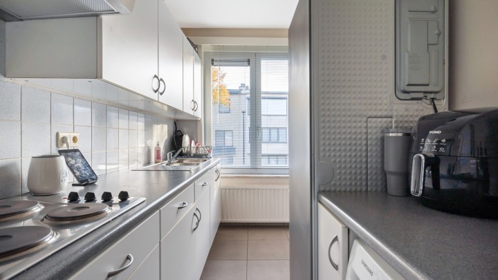 U komt het appartement binnen in de ruime inkomhal met ingebouwde verstiairekast. Deze brengt u naar de lichtrijke woonkamer met keuken. De keuken is voorzien van een dubbele spoelbak, dampkap en een elektrische kookplaat.