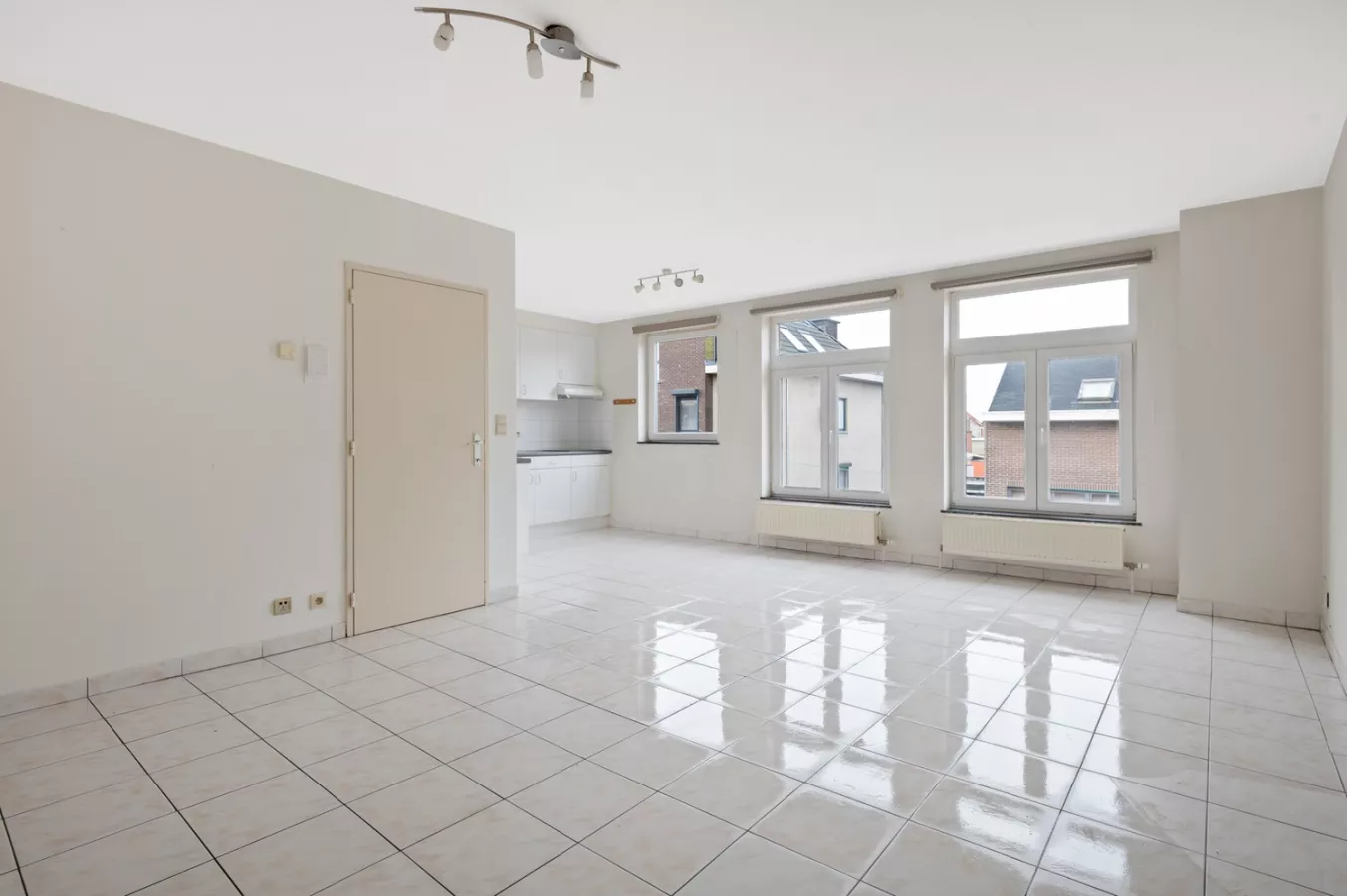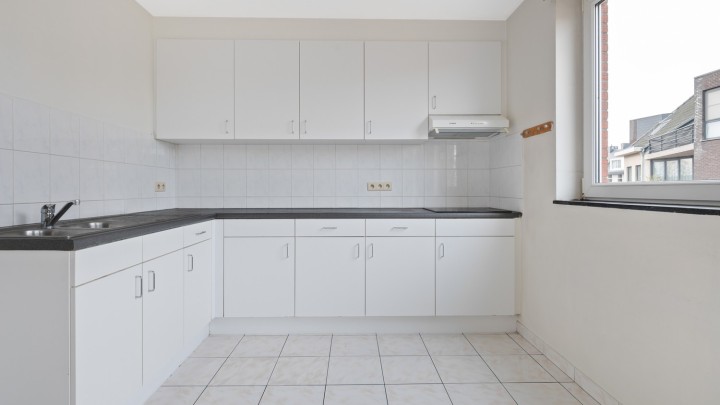 U betreedt het appartement via de inkomhal dewelke u brengt naar de leefruimte met keuken. De keuken is voorzien van een inductiekookplaat, dampkap en dubbele spoelbak.