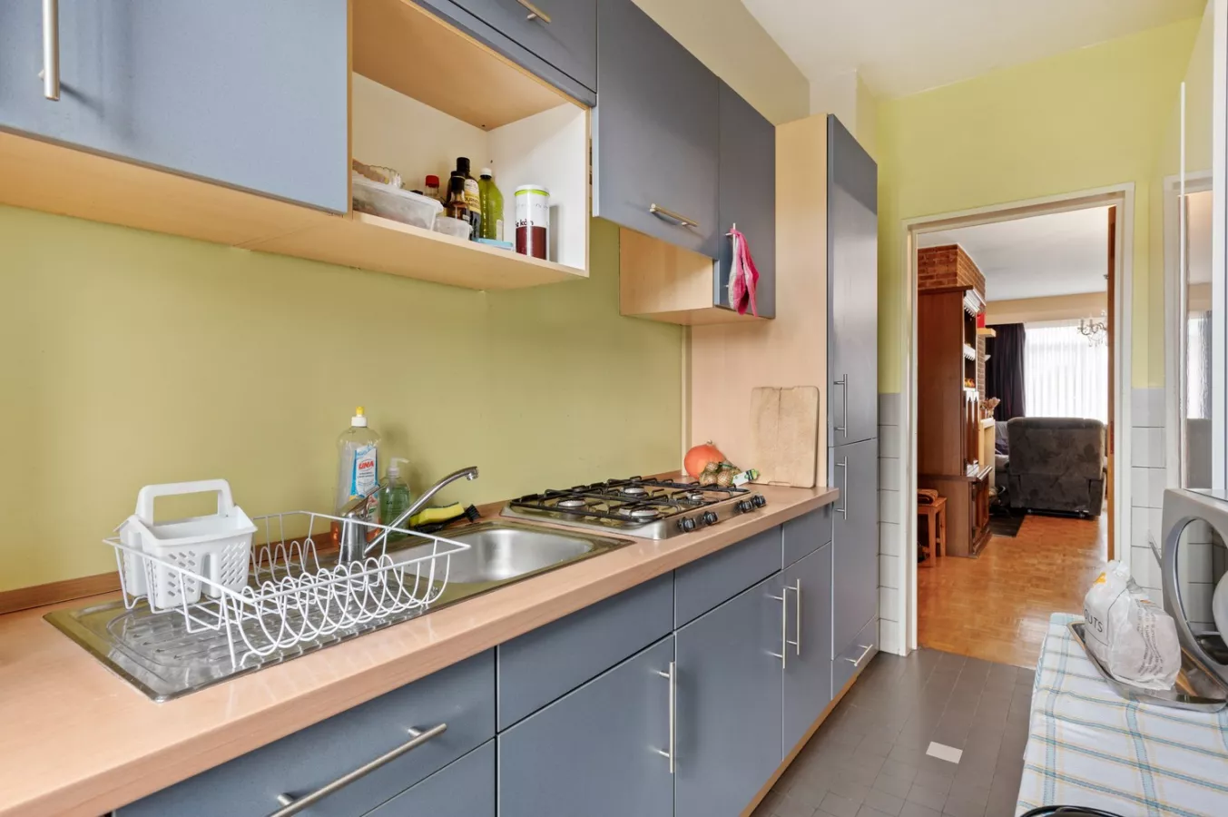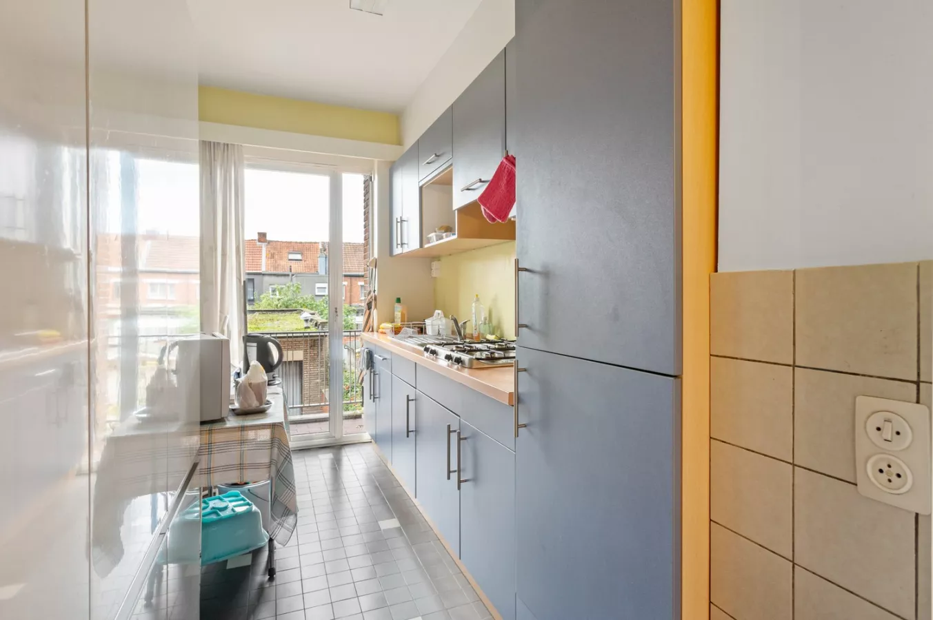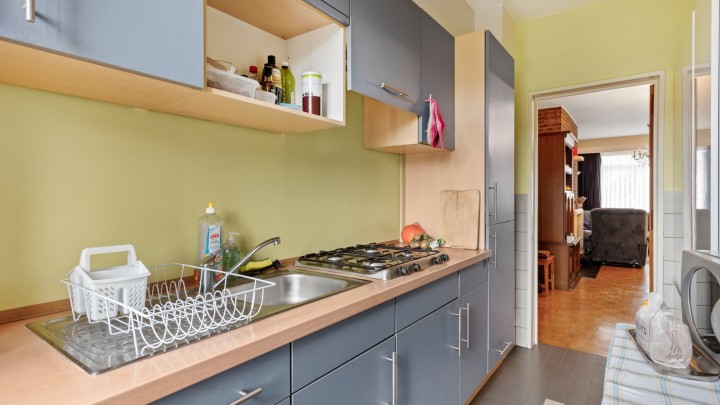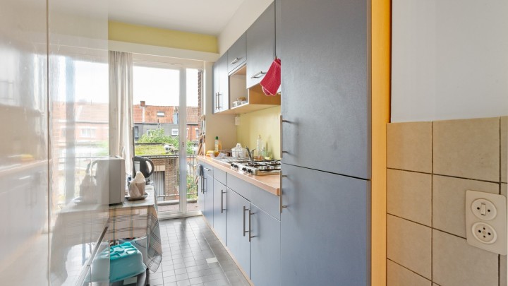 U komt het appartement binnen via de gemeenschappelijke inkomhal. Hierna komt u terecht in de leefruimte met geïnstalleerde keuken voorzien van een enkele spoelbak, gasvuur, dampkap, koelkast, diepvries met toegang tot het terras achteraan.