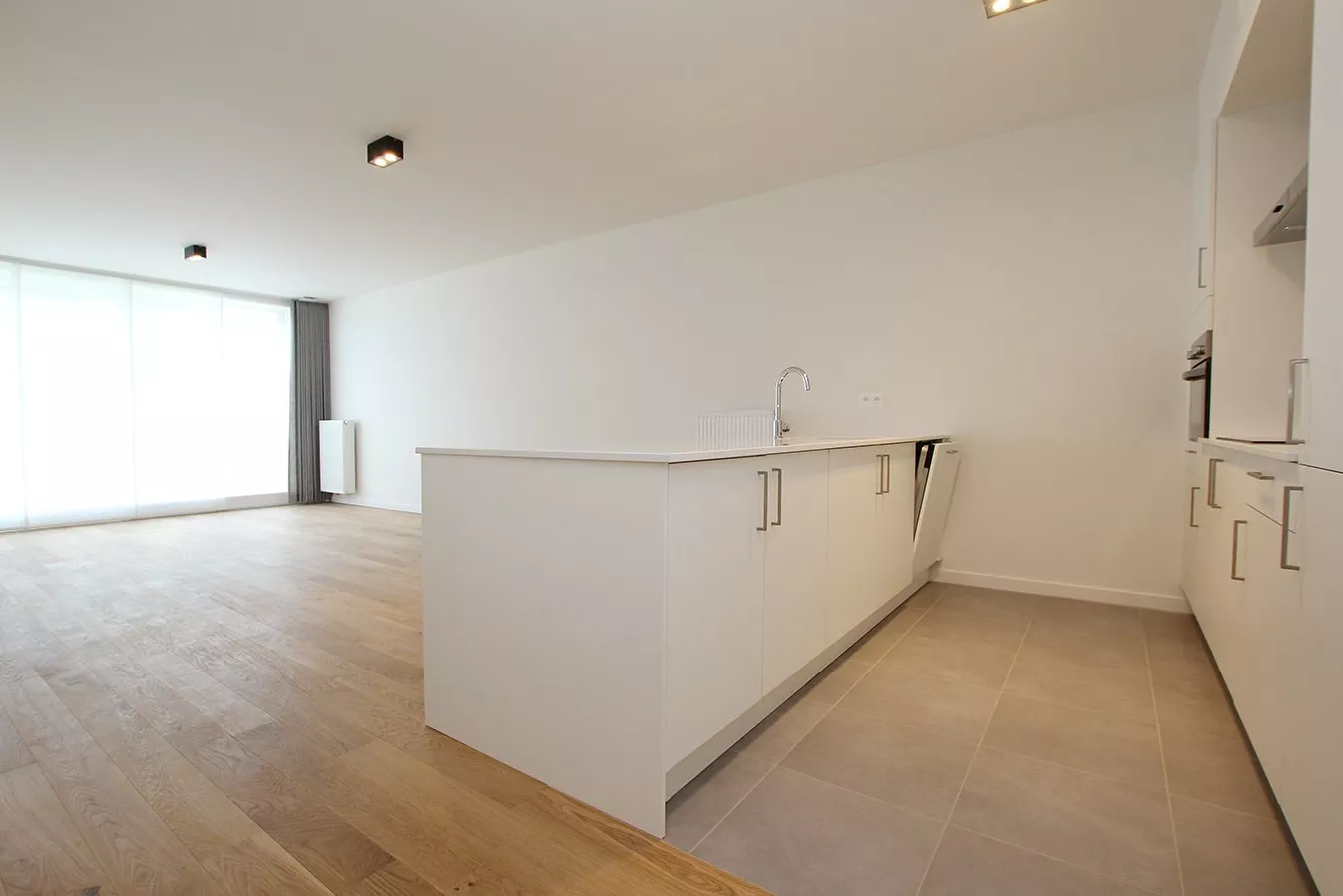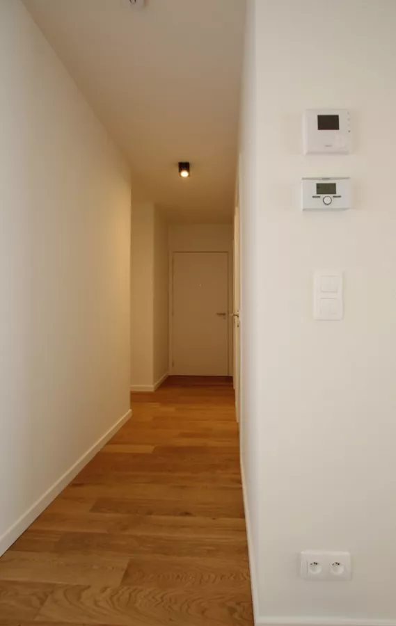 Bij binnenkomst betreed je de nachthal met parketvloer, die toegang biedt tot de verschillende ruimtes. Er is een berging met wasvoorziening, een apart toilet en een ruime leefruimte met een volledig uitgeruste keuken voorzien van een ijskast, een inductiekookplaat, een vaatwasser, een combi-oven en een dubbele spoelbak. De leefruimte baadt in het natuurlijke licht en biedt directe toegang tot het eerste terras, ideaal voor ontspanning.