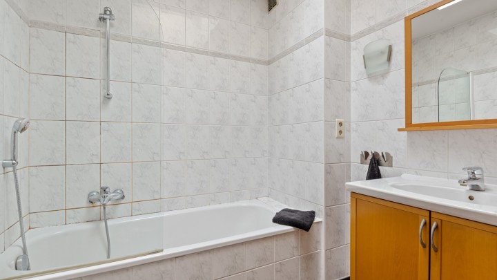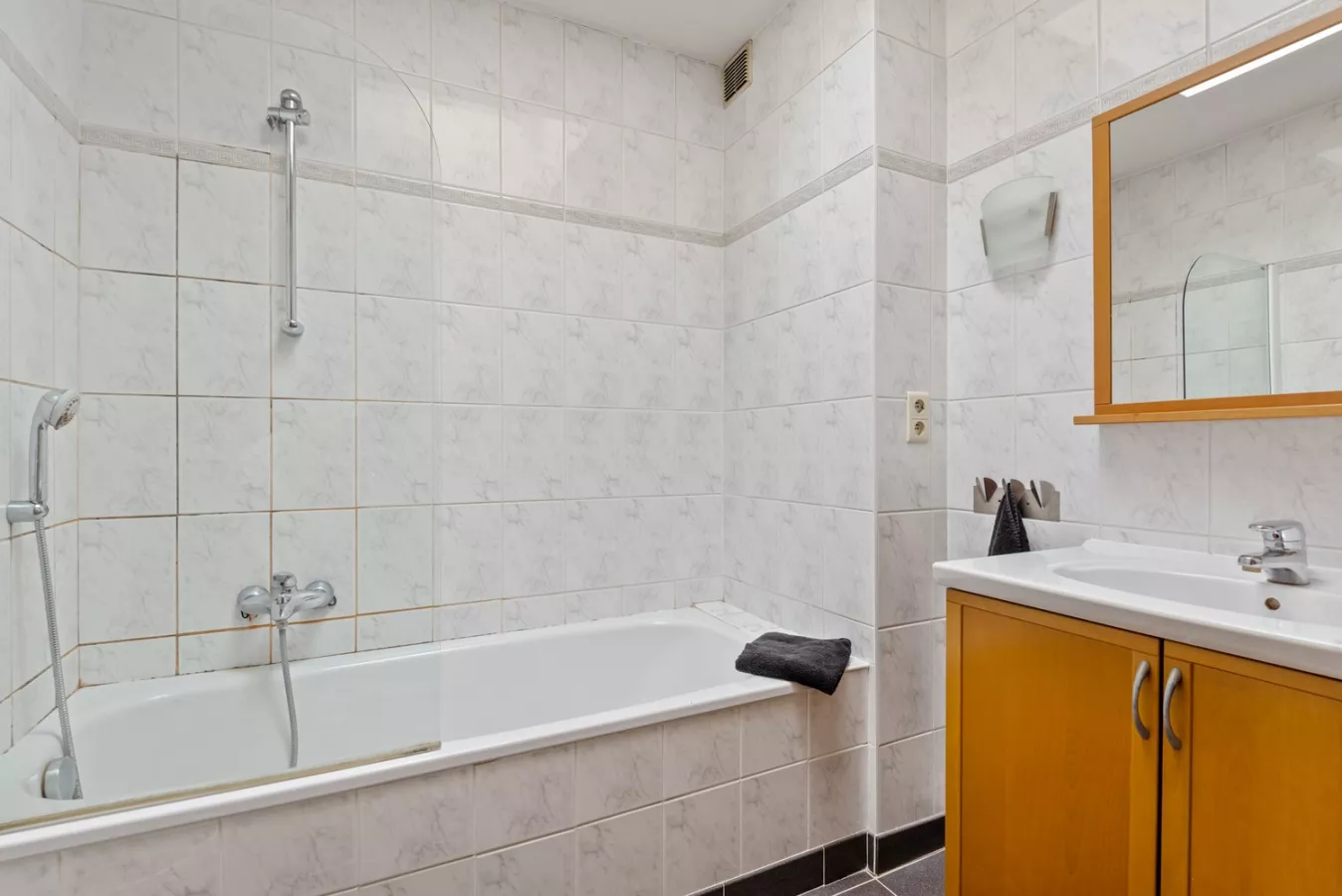 De badkamer is volledig betegeld en beschikt over een bad met douchefunctie. Alsook is hier een lavabo aanwezig.