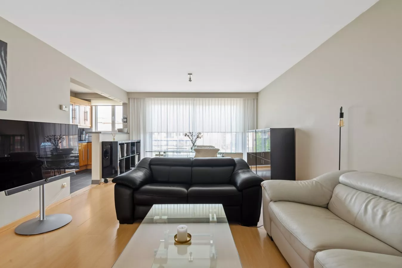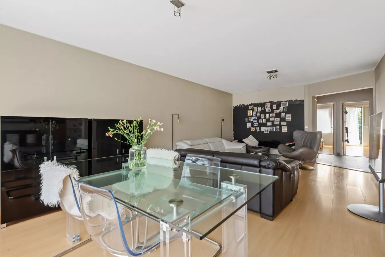 De leefruimte heeft een oppervlakte van 30,50 m² en is voorzien van een laminaatvloer. Het geniet van veel natuurlijke lichtinval en geeft toegang tot de keuken. De keuken is geïntegreerd in de leefruimte en geeft een open, toch gescheiden, gevoel. De keuken heeft een tegelvloer en beschikt over alle nodige voorzieningen zoals een dubbele spoelbak met verlek, microgolfoven, keramisch vuur, dampkap, koelkast en vriezer. Aansluitend bevindt zich de technische ruimte dewelke voorzien is van aansluiting voor wasmachine en droogkast.