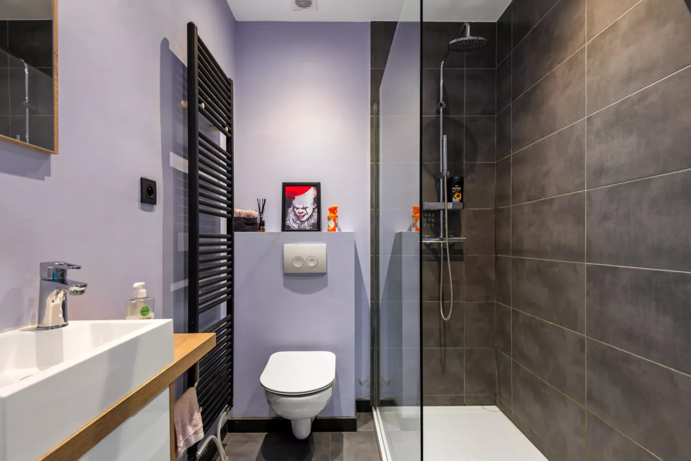 Verder treffen we op het gelijkvloers de eerste badkamer die is voorzien van een inloopdouche, een toilet en een enkele lavabo.