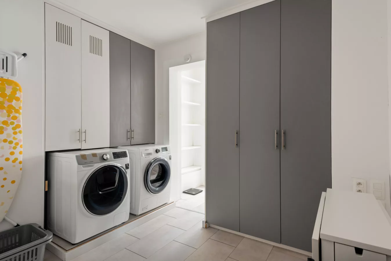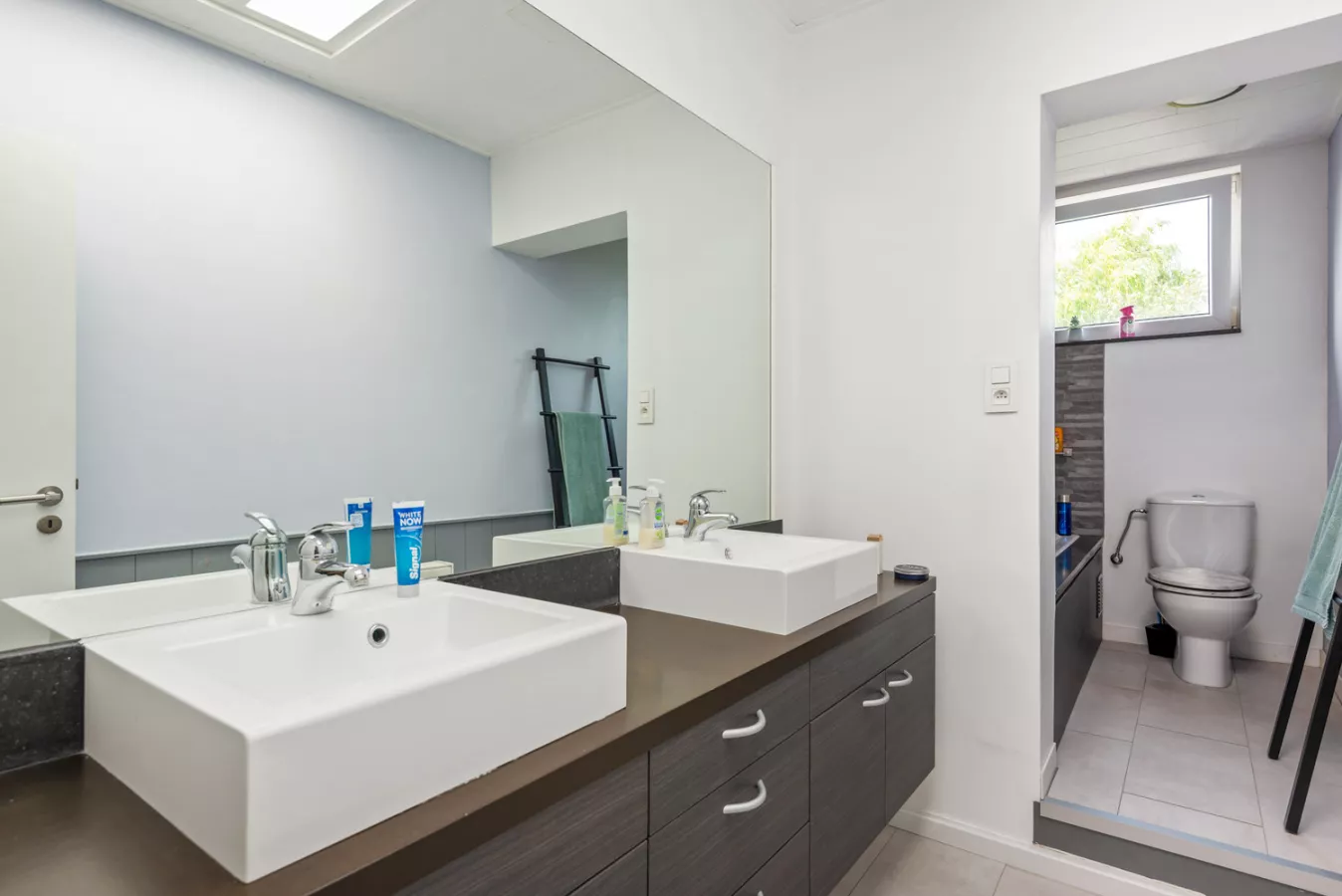 Vervolgens komen we aan de tweede badkamer dewelke is uitgerust met een dubbele lavabo, een toilet en een ligbad met douchefunctie. Daarnaast is er een praktische wasruimte aanwezig met aansluiting voor een wasmachine.