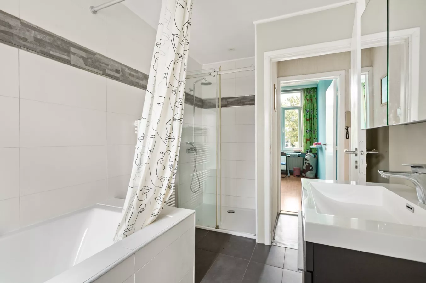 Ten slotte vindt u op deze verdieping een stijlvolle badkamer. Deze is voorzien van een inloopdouche, een bad met douchefunctie, een lavabomeubel, een handdoekradiator en een tweede toilet.