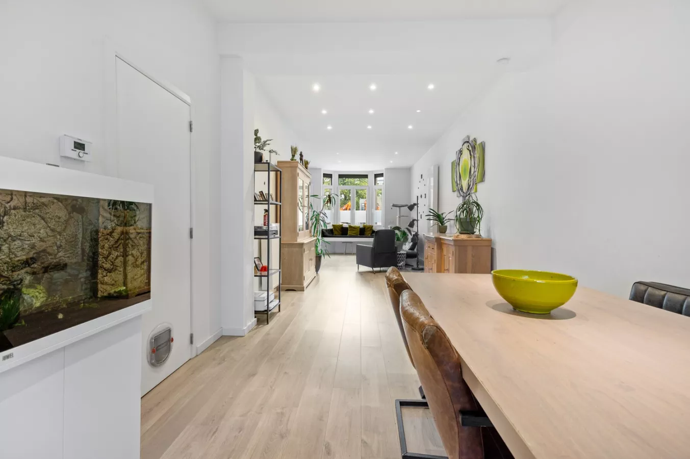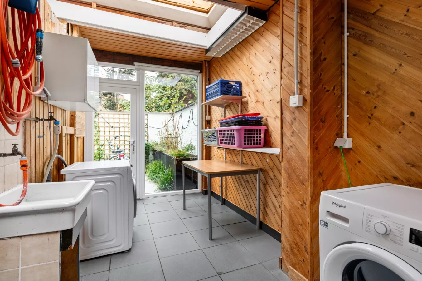 We betreden de woning via de inkomhal. Rechts bevindt zich een polyvalente ruimte van 17 m² – perfect als thuiskantoor, speelruimte of hobbykamer. Van hieruit wandel je verder naar een handige wasberging. Deze biedt toegang tot de koer.