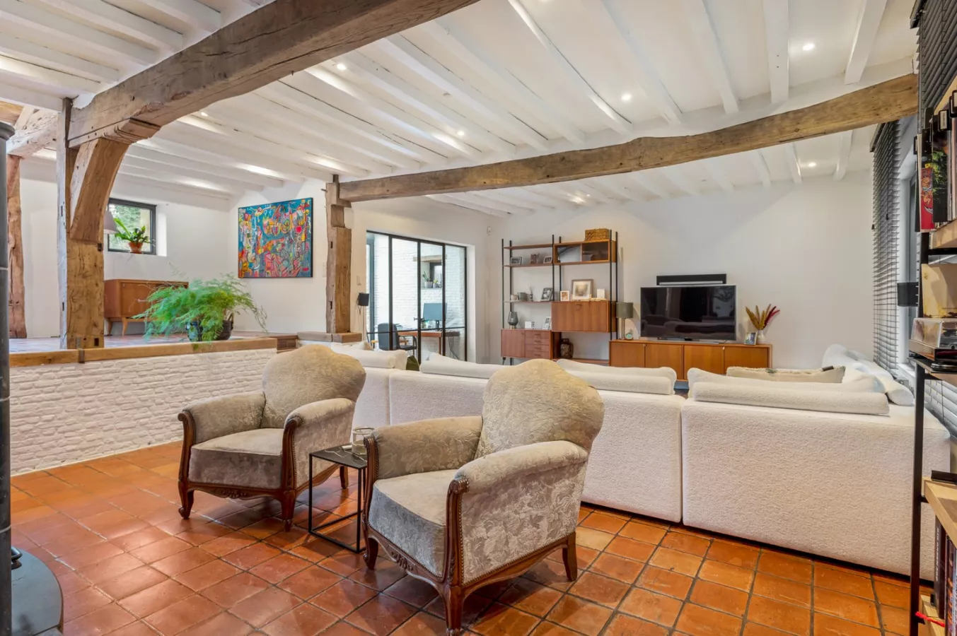 Bij binnenkomst ervaart u meteen de authentieke sfeer in de ruime inkomhal met gastentoilet. De aansluitende woonkamer ademt karakter dankzij de originele tegels en het warme houtwerk van weleer. Een centraal element met speksteenkachels zorgt voor een aangename bijverwarming en een subtiele opsplitsing van de ruimte. De opkamer biedt een extra troef met diverse invulmogelijkheden. Grote raampartijen rondom versterken de connectie met de prachtige groene omgeving.