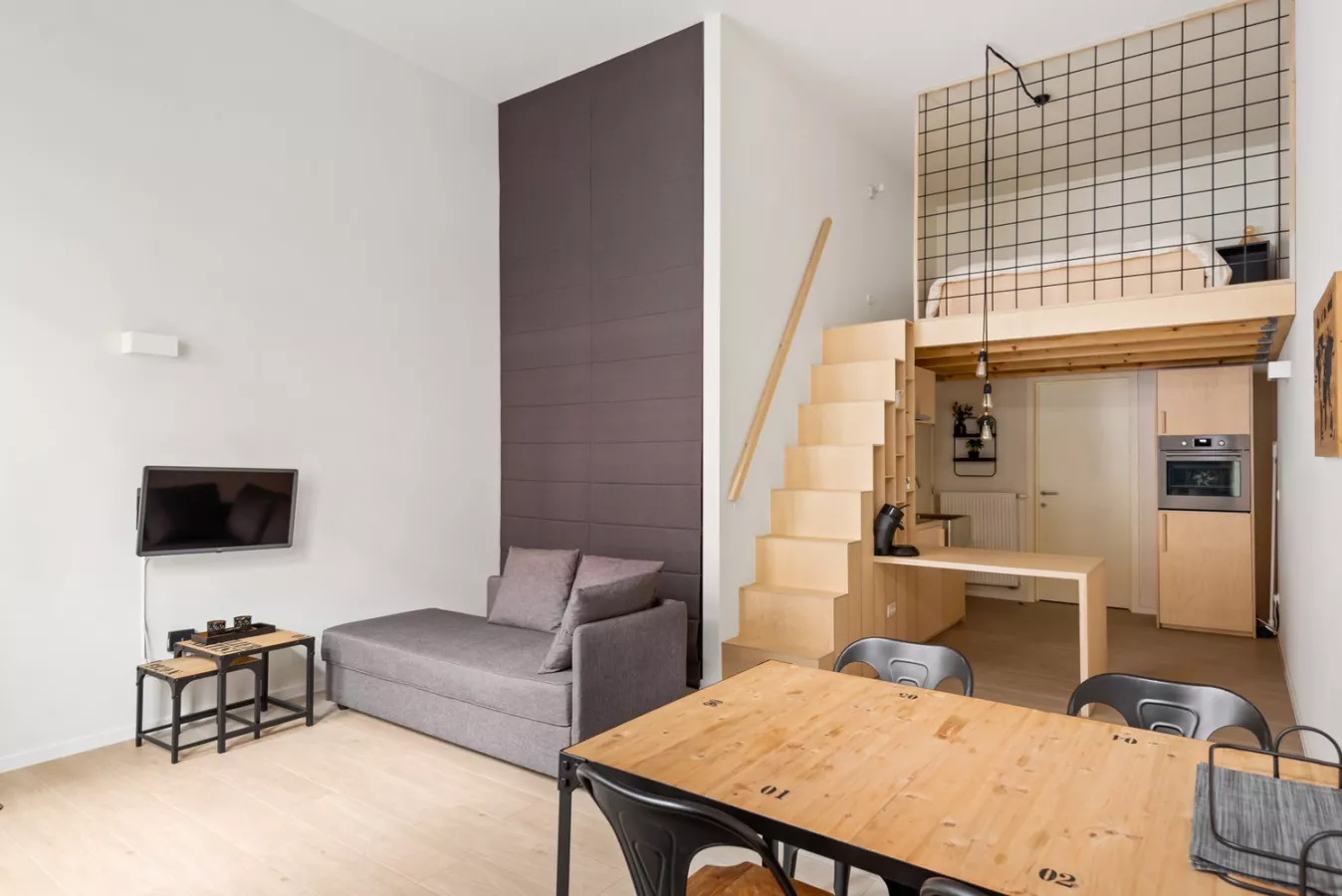 Zo is de keuken volledig voorzien met een ingebouwde ijskast, keramisch vuur, dampkap, combi oven en ingewerkte tafel. Hierboven vindt men de Eyecatcher wat van de studio praktisch een appartement maakt, de Mezzanine.