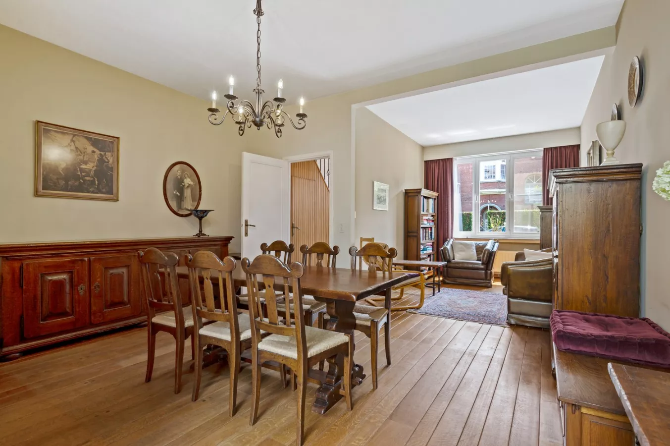 U betreedt de woning via de inkomhal, dewelke u brengt naar de zitruimte. Deze is uitgerust met een prachtige parketvloer en veel natuurlijk lichtinval.