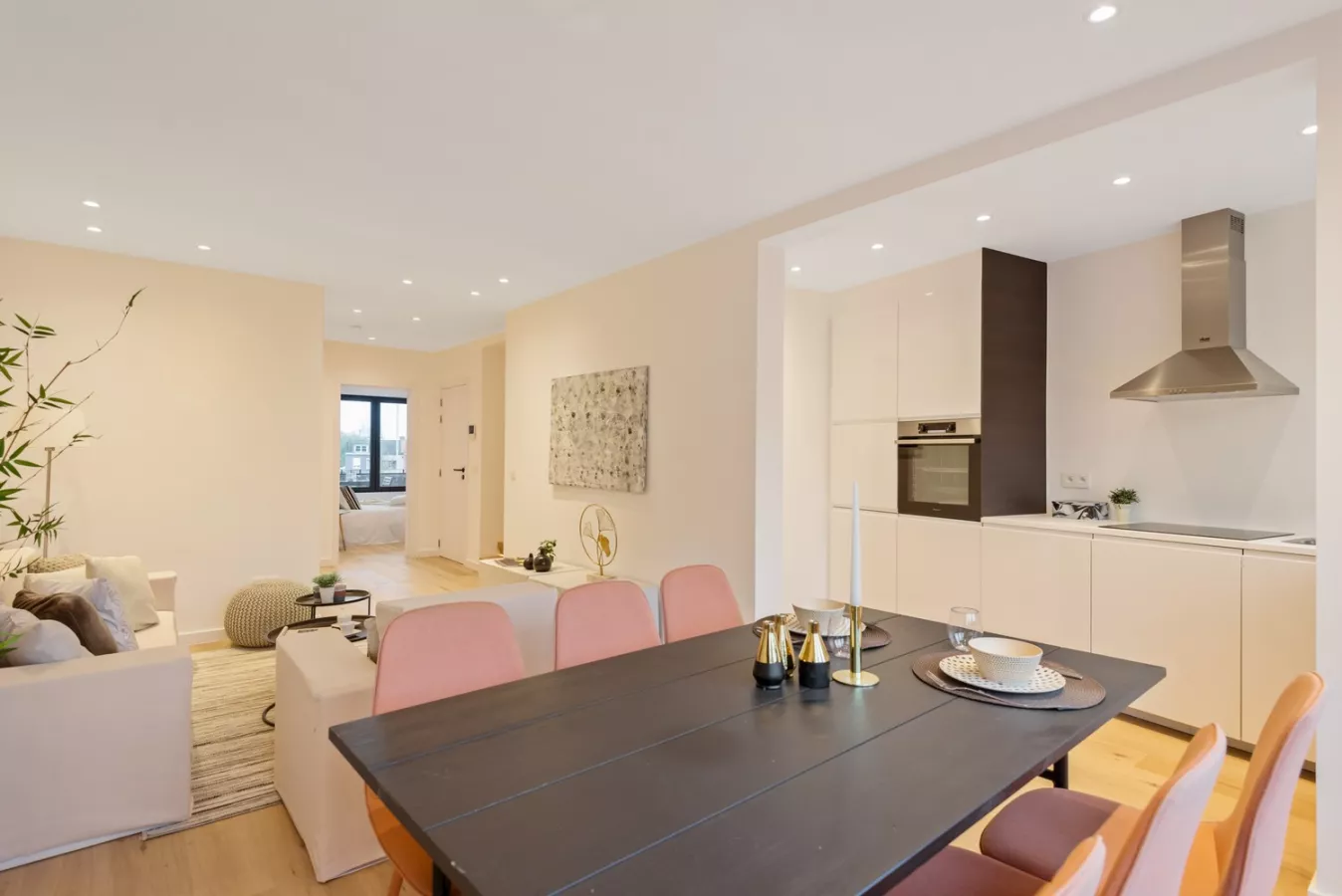 We betreden de woning via de tweede verdieping waarbij de hedendaags afgewerkte en lichtrijke woonkamer meteen in het oog springt.