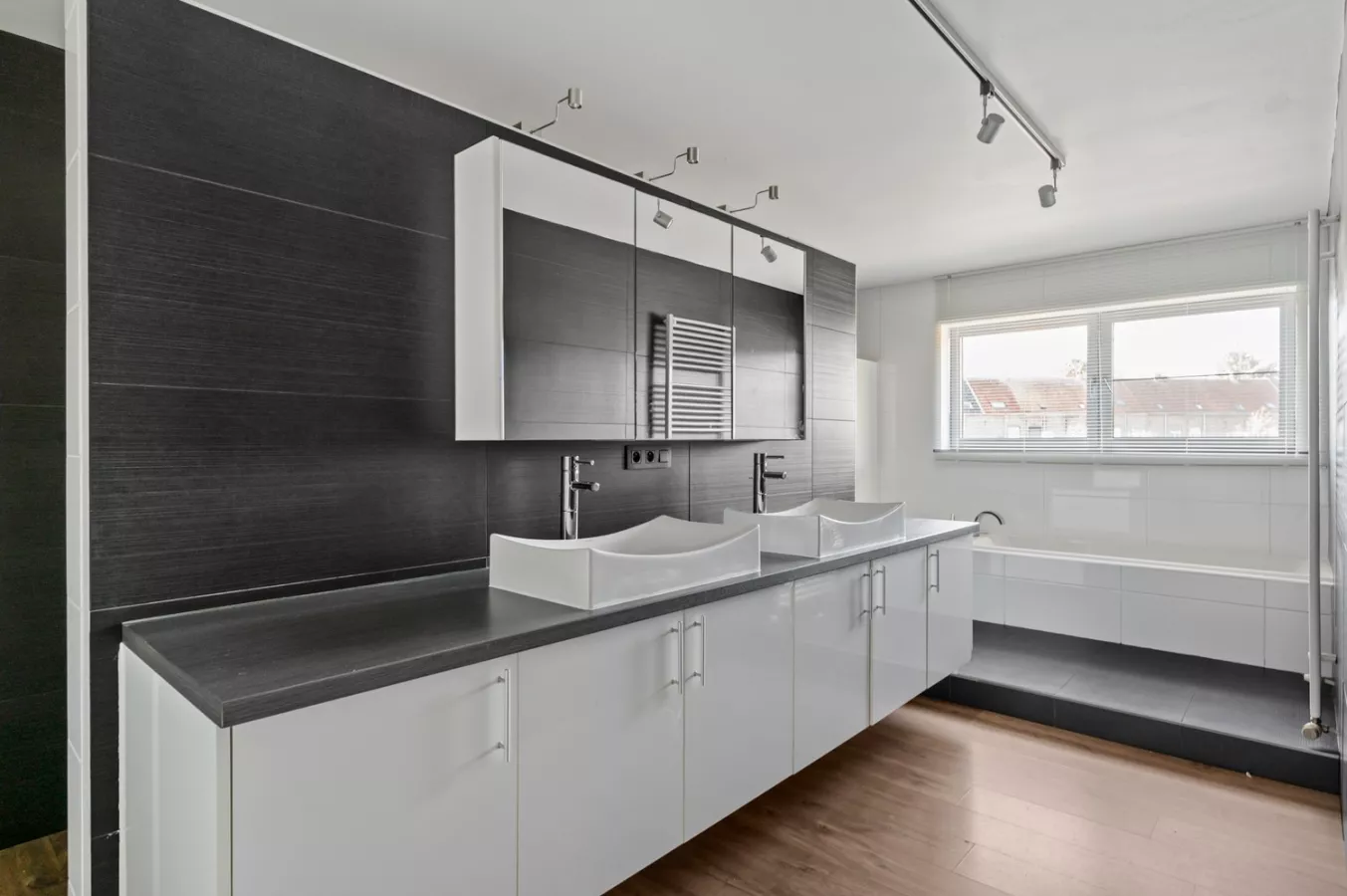 De badkamer is voorzien van een ligbad, inloopdouche, dubbele lavabo in badkamermeubel en een toilet.