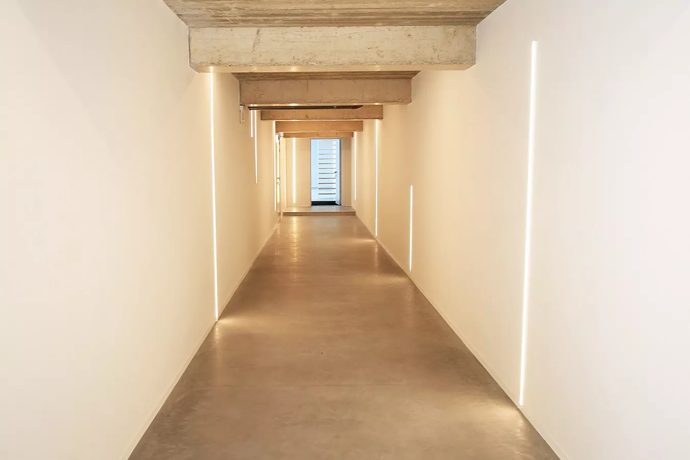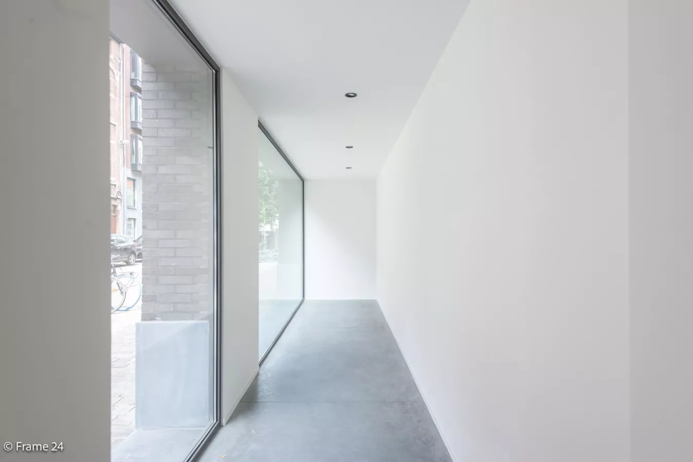 We betreden de eigendom via de riante, privatieve inkomhal. Deze geeft toegang tot de garage voor twee auto's, privatieve berging alsook de leefruimte.