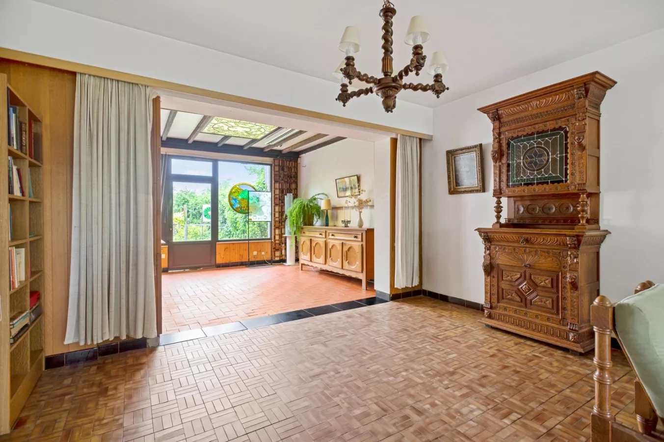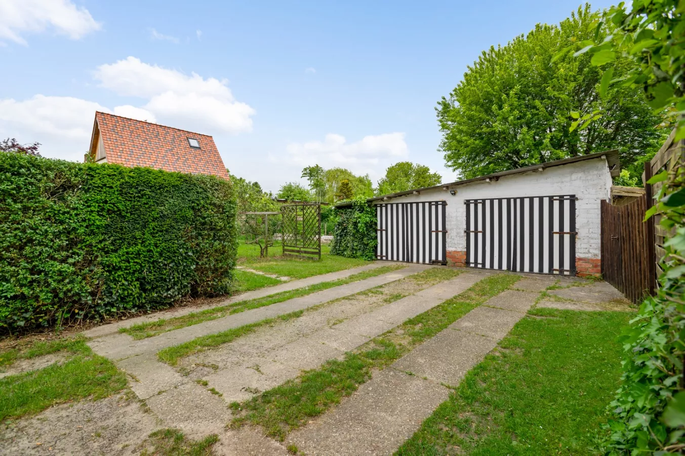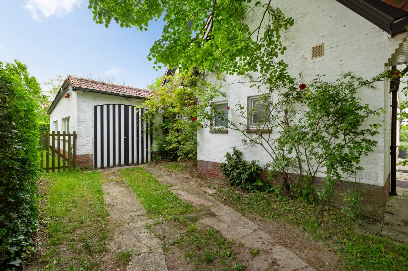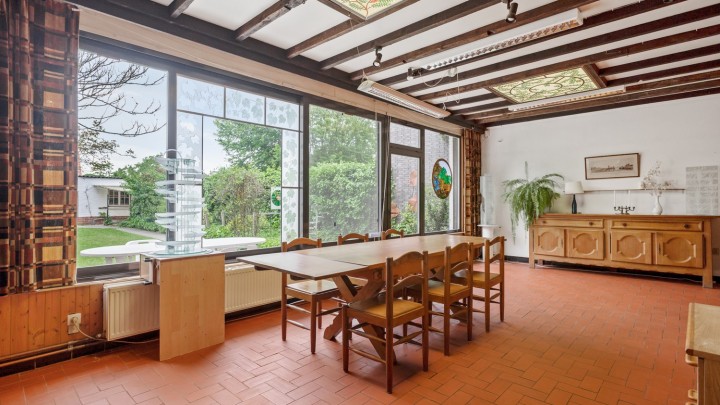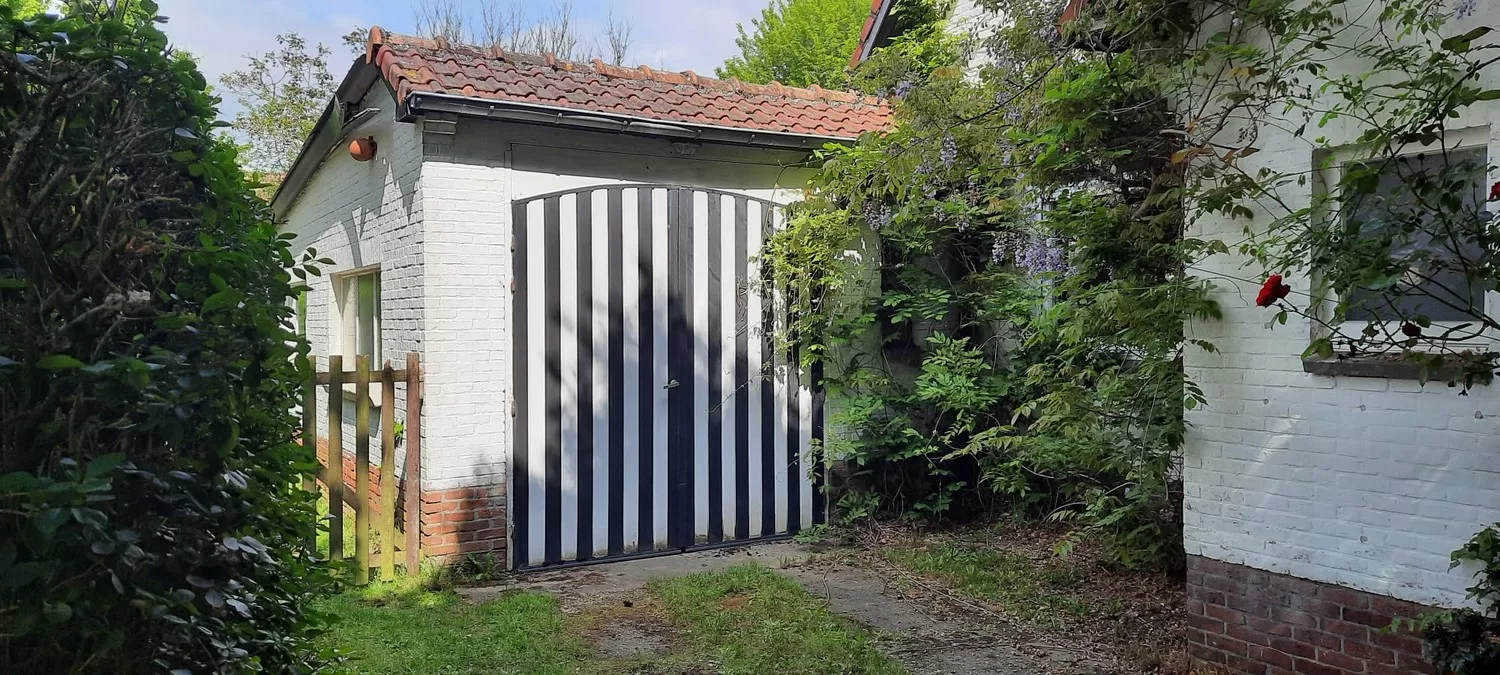 Gedeeltelijk te renoveren halfopen woning met 3 à 4 slaapkamers, drie garages en prachtige tuin te koop te Wijnegem