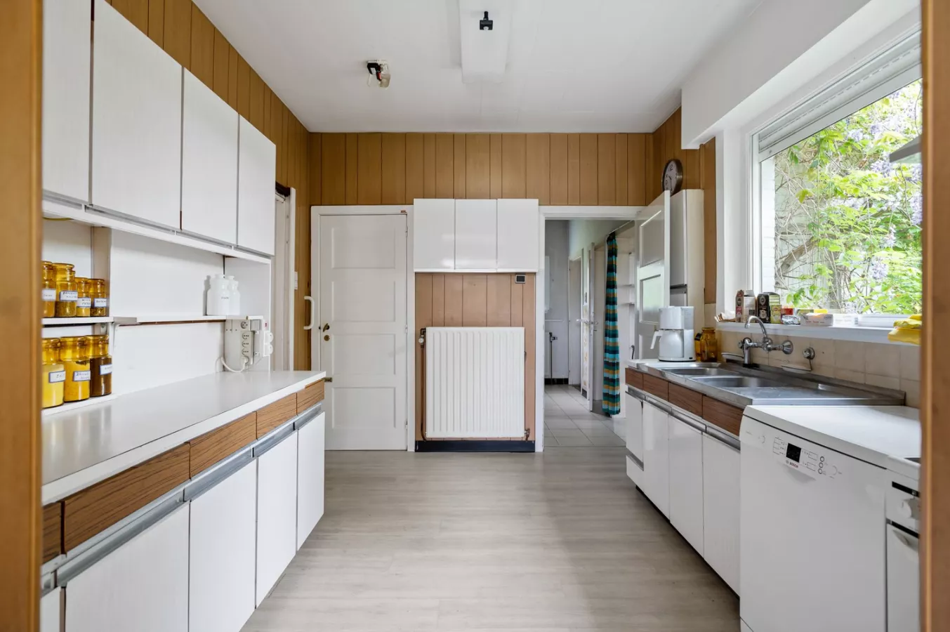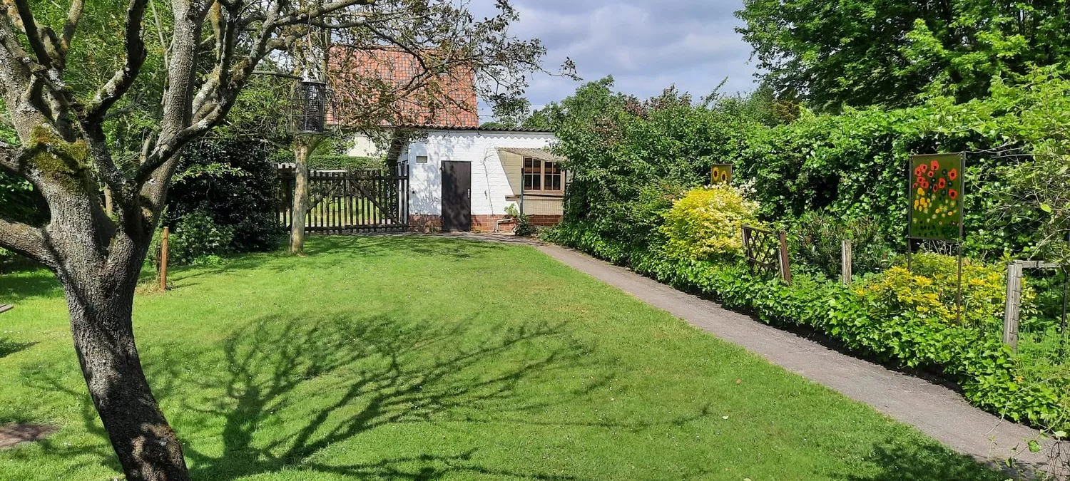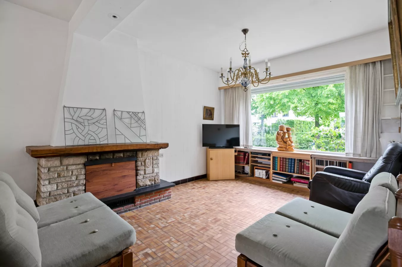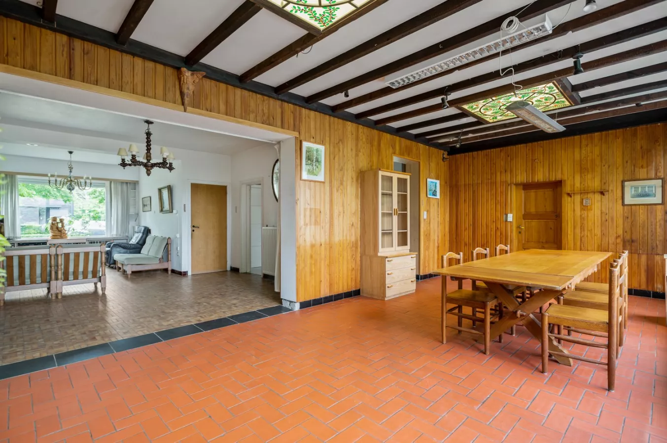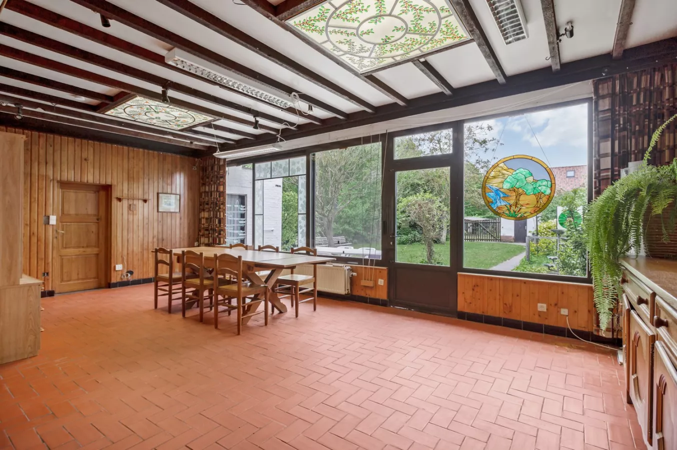 Gedeeltelijk te renoveren halfopen woning met 3 à 4 slaapkamers, drie garages en prachtige tuin te koop te Wijnegem