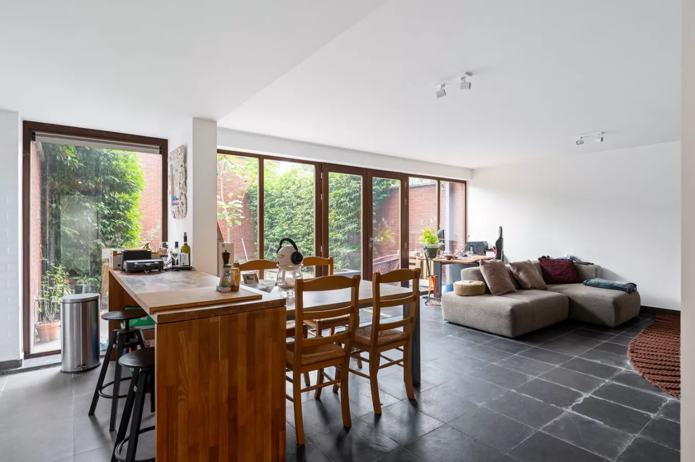 Via de ruime inkomhal komt u binnen in de lichtrijke leefruimte met open keuken. Grote ramen brengen overvloedig daglicht naar binnen en creëren een directe verbinding met de tuin, die een verlengstuk vormt van de leefruimte. De keuken is volledig uitgerust met kwalitatieve toestellen zoals een vaatwasser, oven, inductiekookplaat, dampkap, spoelbak en een koelkast met diepvries, waardoor koken een plezier wordt.