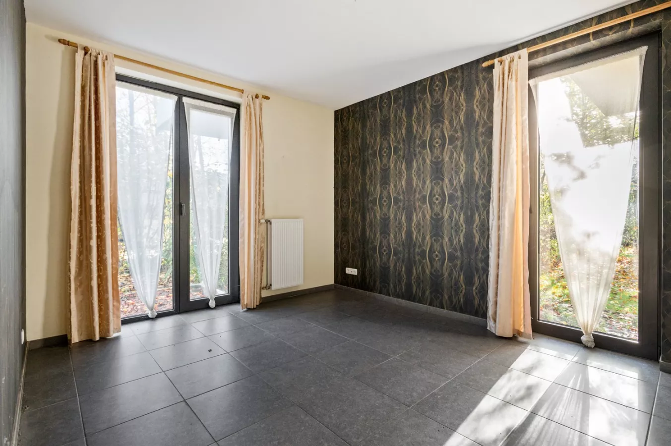 De leefruimte vloeit naadloos door in de open, volledig geïnstalleerde keuken welke voorzien werd van alle toestellen.