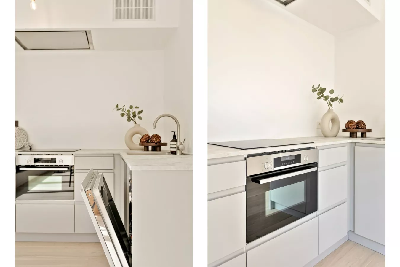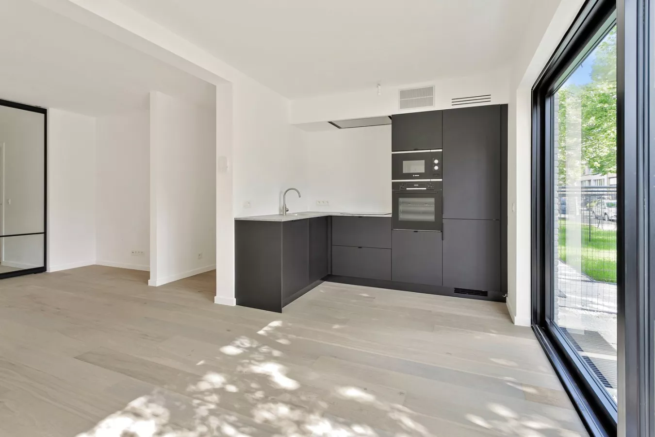 De open en lichtrijke leefruimte vormt één geheel met de prachtige zwarte open keuken. Deze keuken werd voorzien van alle toestellen en geniet bovendien van een goot schuifraam die uitgeeft op de ideale tuin aan de voorzijde.