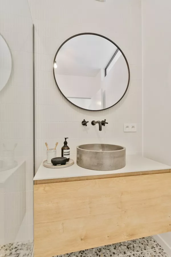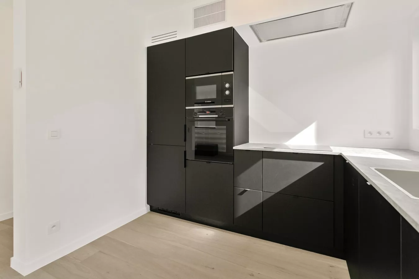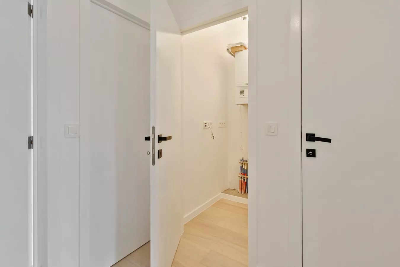 De nachthal geeft toegang tot een prachtig afgewerkte badkamer met regendouche en een houten stijlvolle lavabomeubel, al het kraanwerk is bovendien zwart afgewerkt. Verder geniet het appartement van een apart toilet met handenwasser, een aparte berging met aansluiting voor de was en droogmachine.