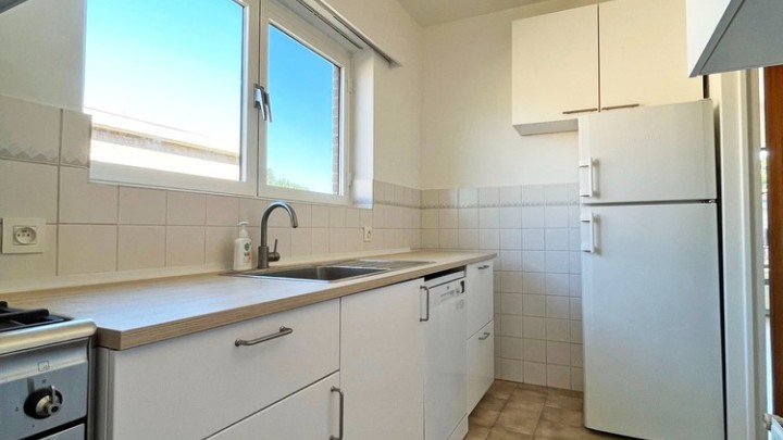 De inkomhal geeft toegang tot de lichtrijke leefruimte door de grote raampartij vooraan. De verzorgde keuken is bereikbaar via de leefruimte en is voorzien van een spoelbak met verlek, een vaatwasser, een koelkast met diepvriesvak, een oven, een gasvuur en een dampkap.