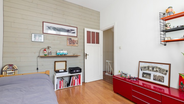 De eerste verdieping omvat een nachthal met toegang tot twee ruime slaapkamers (21 m² / 10 m²), de grootste slaapkamer geeft uit op de badkamer. De laatste kamer (4m²) kan dienst doen als kleine bureauruimte of als babykamer.