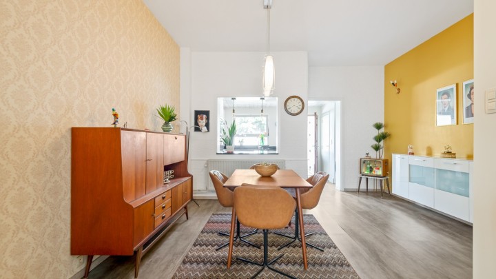 We komen deze charmante woning binnen via de inkomhal. Aan uw linkerzijde betreedt u de eetkamer op nieuw geplaatste laminaat vloer (visgraat parket), aan de voorgevel bevindt zicht de knusse leefruimte. Deze is nog steeds voorzien van de originele houten parket vloer. Achteraan bevindt zich de open keuken maar toch verbonden met de eetkamer. Een aparte nis werd voorzien voor droog en was aansluitingen. Een apart gastentoilet grenst aan deze nis. De keuken is volledig geïnstalleerd (microgolf – oven – dampkamp – vaatwasser , …) en dit op een graniet top-werkblad; de toestellen zijn van NEFF en u kan tevens koken op het stijlvol in graniet afgewerkt kookeiland.