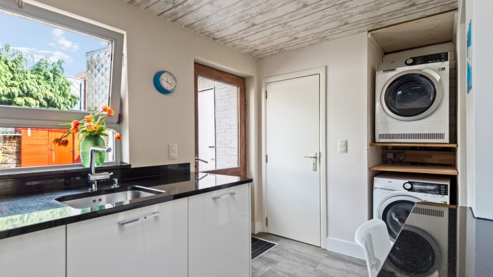 De keuken geeft uit op het prachtig aangelegd Oost-georiënteerd stadstuintje. Er werden 2 extra bergingen voorzien in de tuin. Kortom geen plaatsgebrek voor diegene met groene vingers!