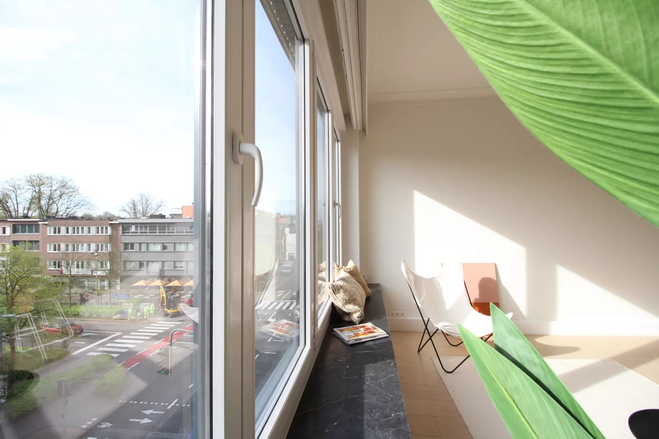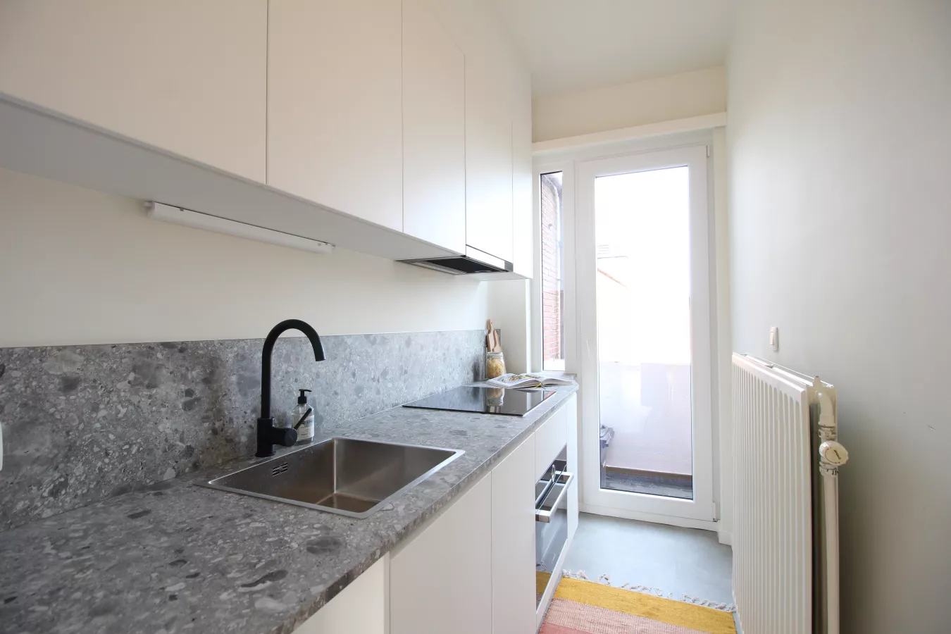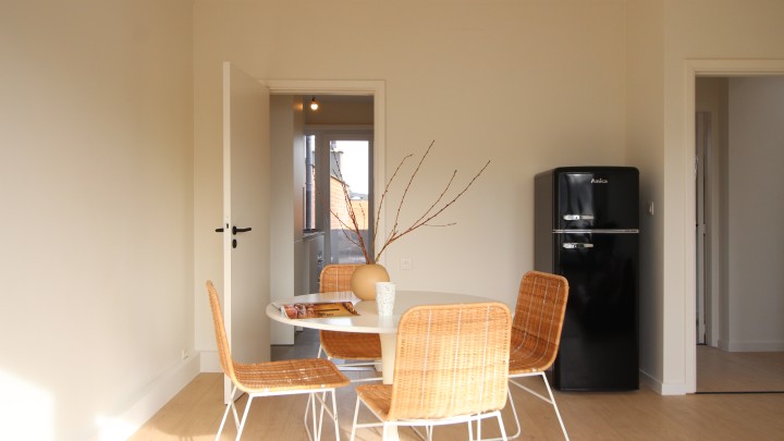 Je betreedt het appartement via de inkomhal, welke werd uitgerust met ingemaakte vestiairekast. De lichte en aangename leefruimte op parket biedt uitzicht op de prachtige Sint-Antonius kerk alsook de groene bomen van het park. Grenzend aan de leefruimte vinden we de keuken, welke tevens beschikt over een aansluiting voor de wasmachine. Vanuit de keuken verkrijg je tevens toegang tot het terras.