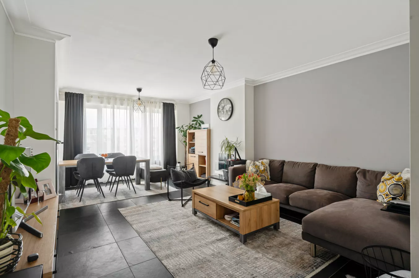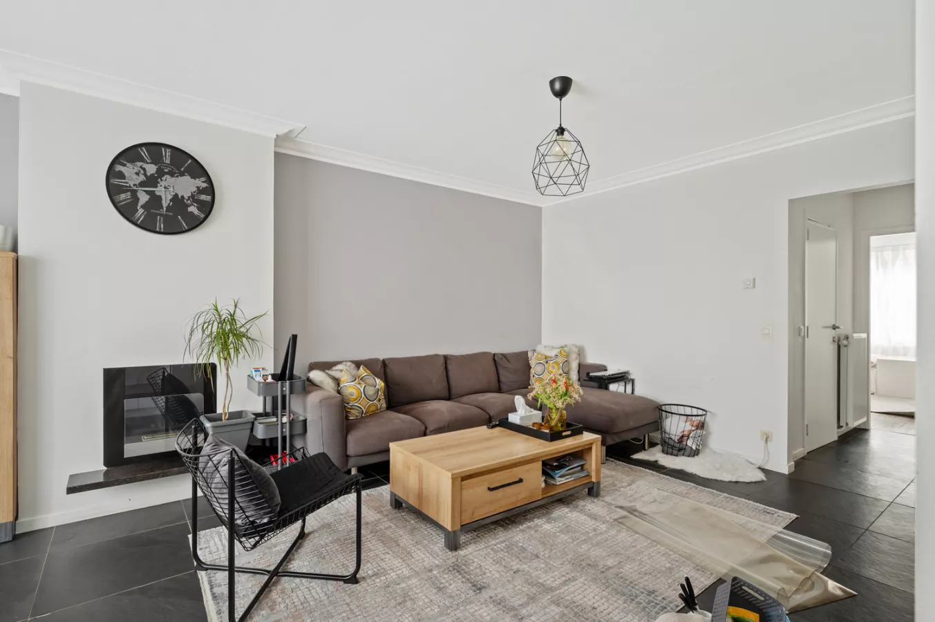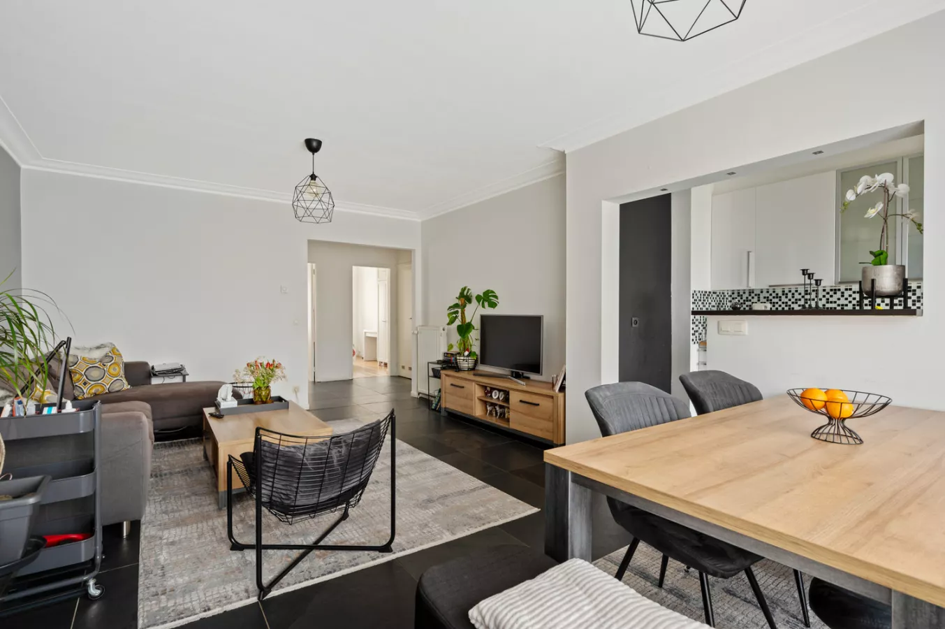 Het appartement beschikt over een ruime inkomhal die toegang geeft tot de verschillende ruimtes. De leefruimte geniet dankzij de grote raampartijen van veel lichtinval. De volledig geïnstalleerde keuken is vooraan gelegen in het appartement.