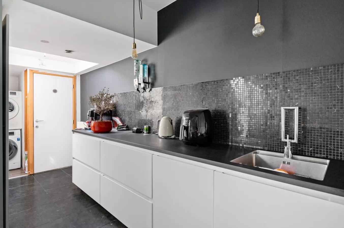 Naast de keuken bevindt zicht een apart toilet en de wasruimte met aansluiting voor wasmachine en droogkast.