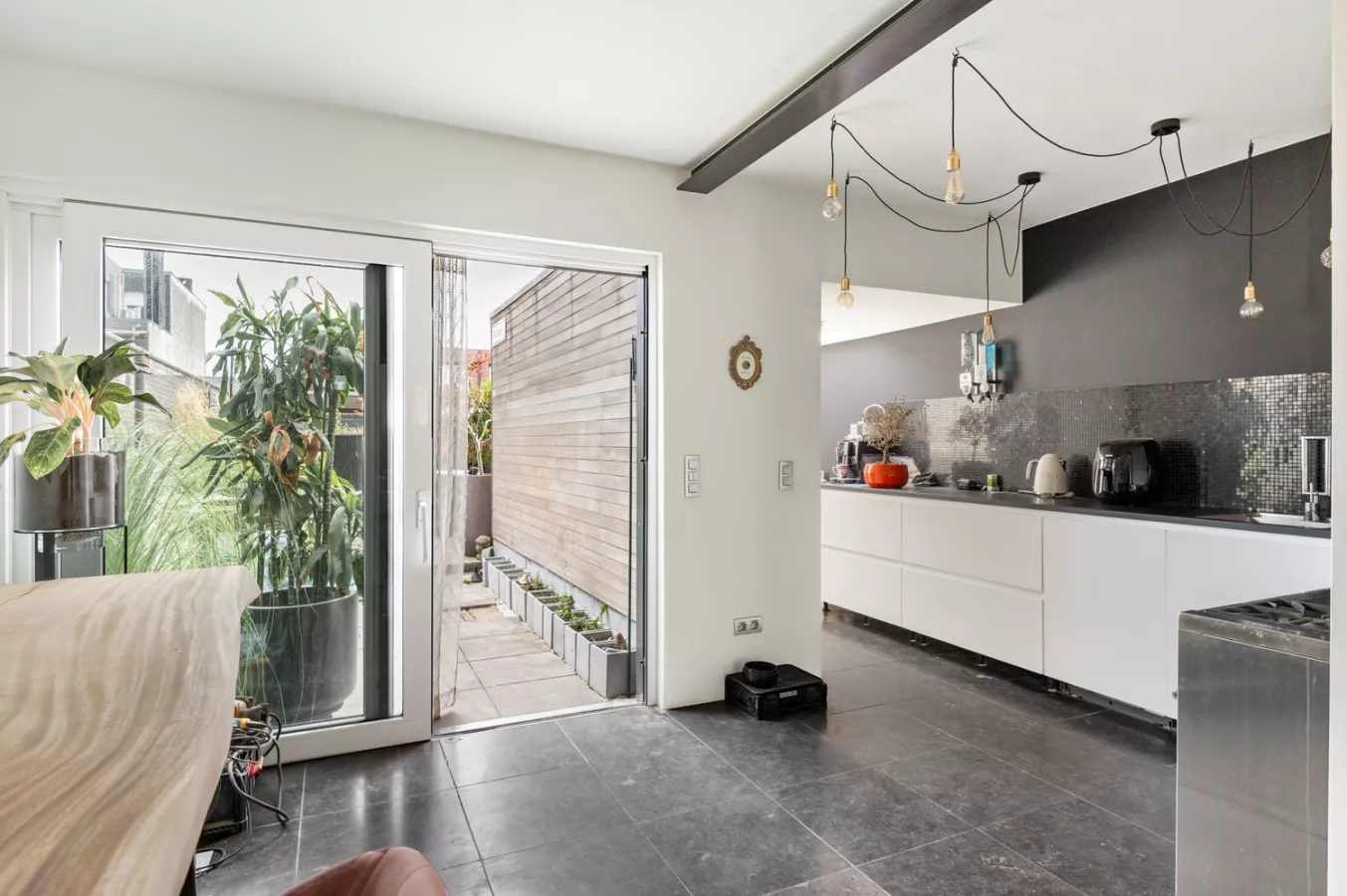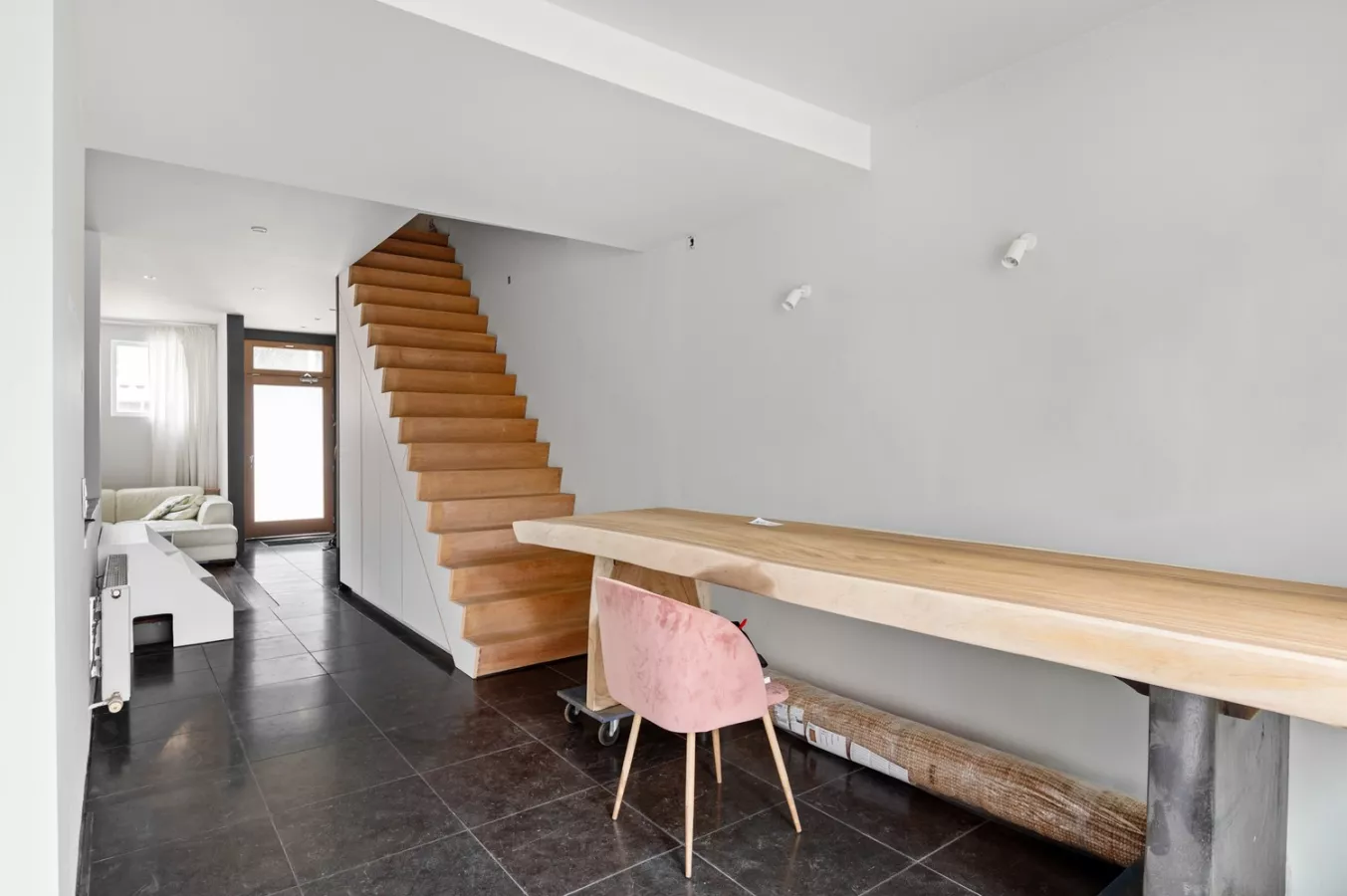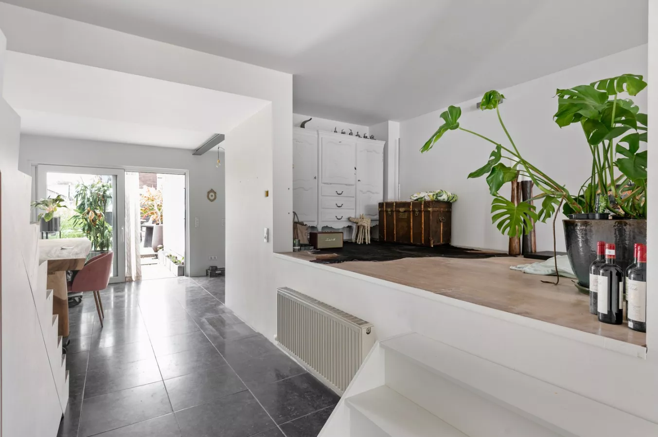 De inkom brengt ons naar de woonkamer, met unieke vide welke momenteel dienst doet als bureauruimte. De lichtrijke, volledig uitgeruste keuken, oogt modern en heeft een gezellige eethoek.