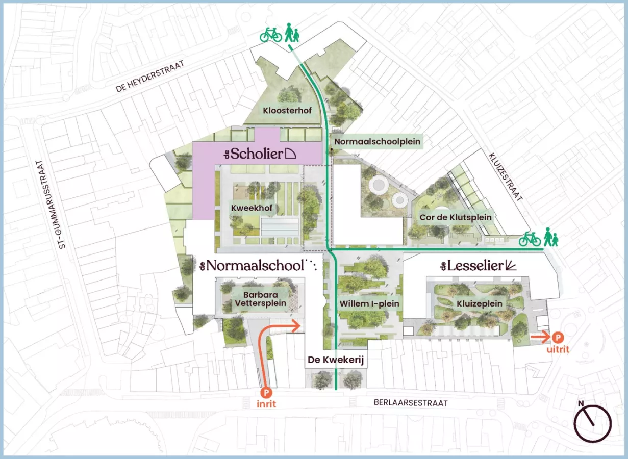 De site combineert karaktervolle renovatie met hedendaagse nieuwbouw en omvat onder meer De Lesselier (moderne BEN-appartementen rond een groene binnentuin) en De Scholier (stijlvol gerenoveerde appartementen met behoud van authentieke elementen).