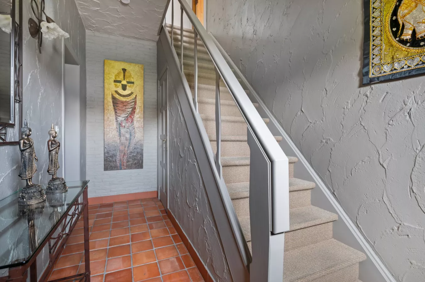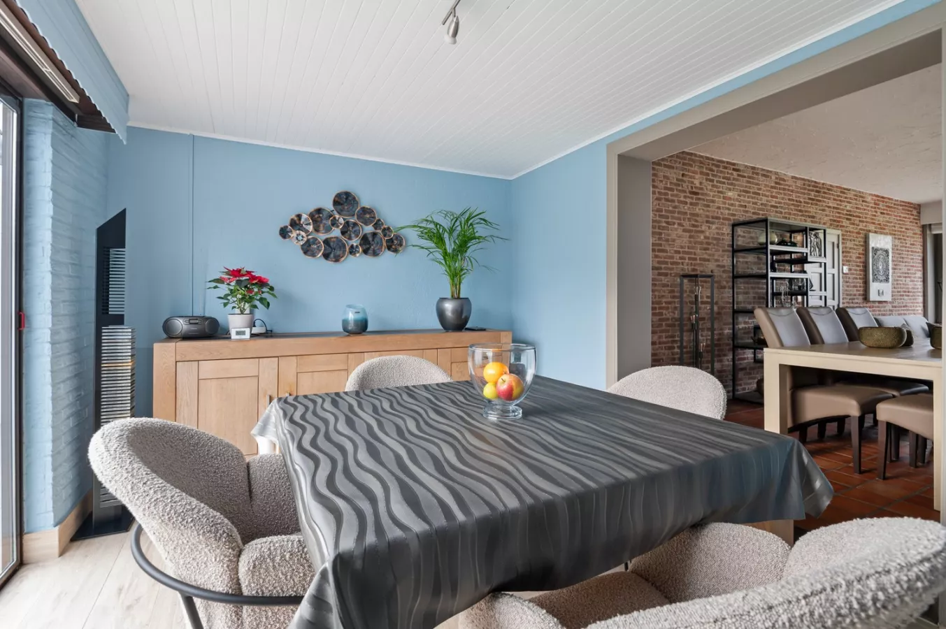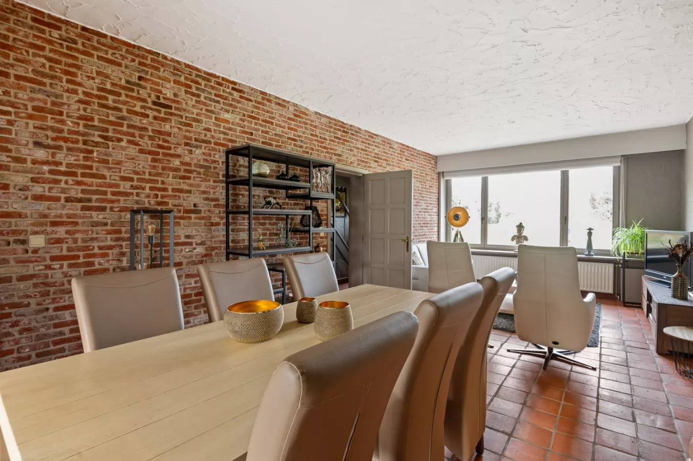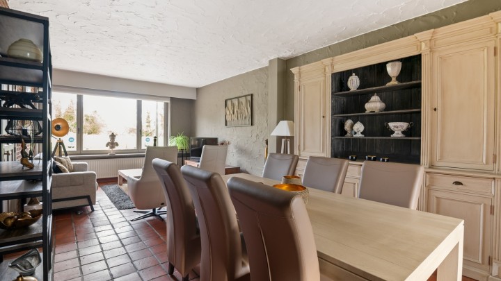 We betreden de woning via de inkomhal dewelke uitgeeft op de lichtinvalrijke leefruimte die doorloopt naar eetkamer en de keuken.
