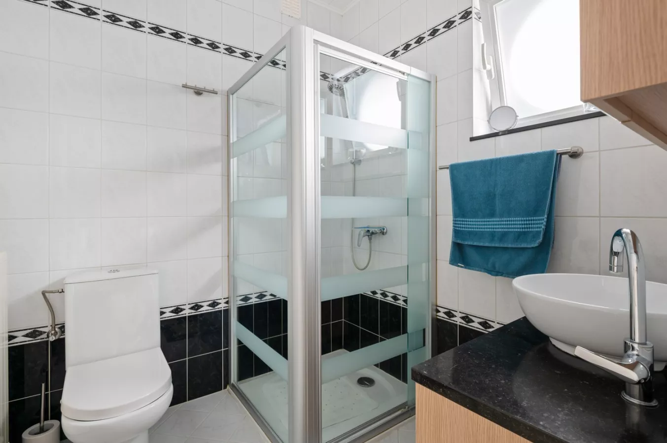 Verder treffen we op het gelijkvloers nog de eerste badkamer. Deze is voorzien van een enkel lavabomeubel, douche en toilet.