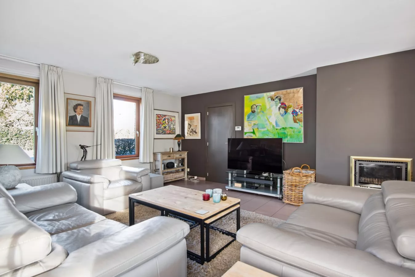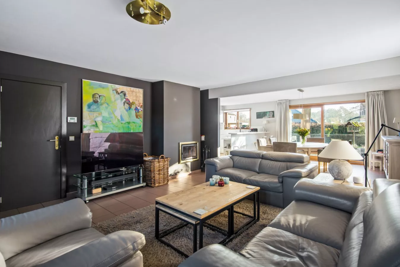 U komt het huis binnen via de inkomhal. Deze is voorzien van een gastentoilet en brengt u naar de lichtrijke leefruimte. Deze is afgewerkt met een tegelvloer en beschikt over een houten haard met ventilatie. Grote raampartijen zorgen voor veel lichtinval en bieden rechtstreekse toegang tot de prachtige tuin (zuid georiënteerd).