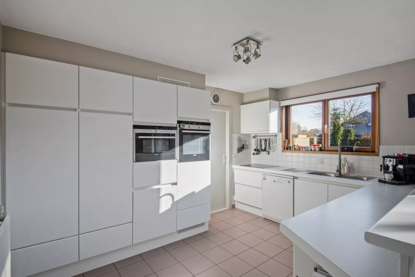 Aansluitend bevindt zich de open keuken, afgewerkt met een tegelvloer en half betegelde wanden. De keuken is ingericht met boven- en onderkasten, oven, micro-oven, dubbele spoelbak, inductiekookplaat en dampkap.