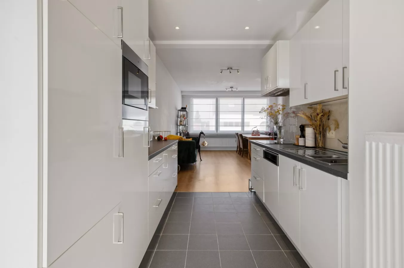 Het appartement is gelegen op de tweede verdieping en verwelkomt u via de inkomhal. Vervolgens komt u in de lichte leefruimte met open keuken. De keuken is volledig uitgerust met een keramische kookplaat, dubbele spoelbak, vaatwasser, dampkap, koelkast met vriesvak en een combi-oven. Vanuit de keuken heeft u bovendien toegang tot een aangenaam terras, ideaal om te ontspannen.