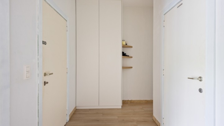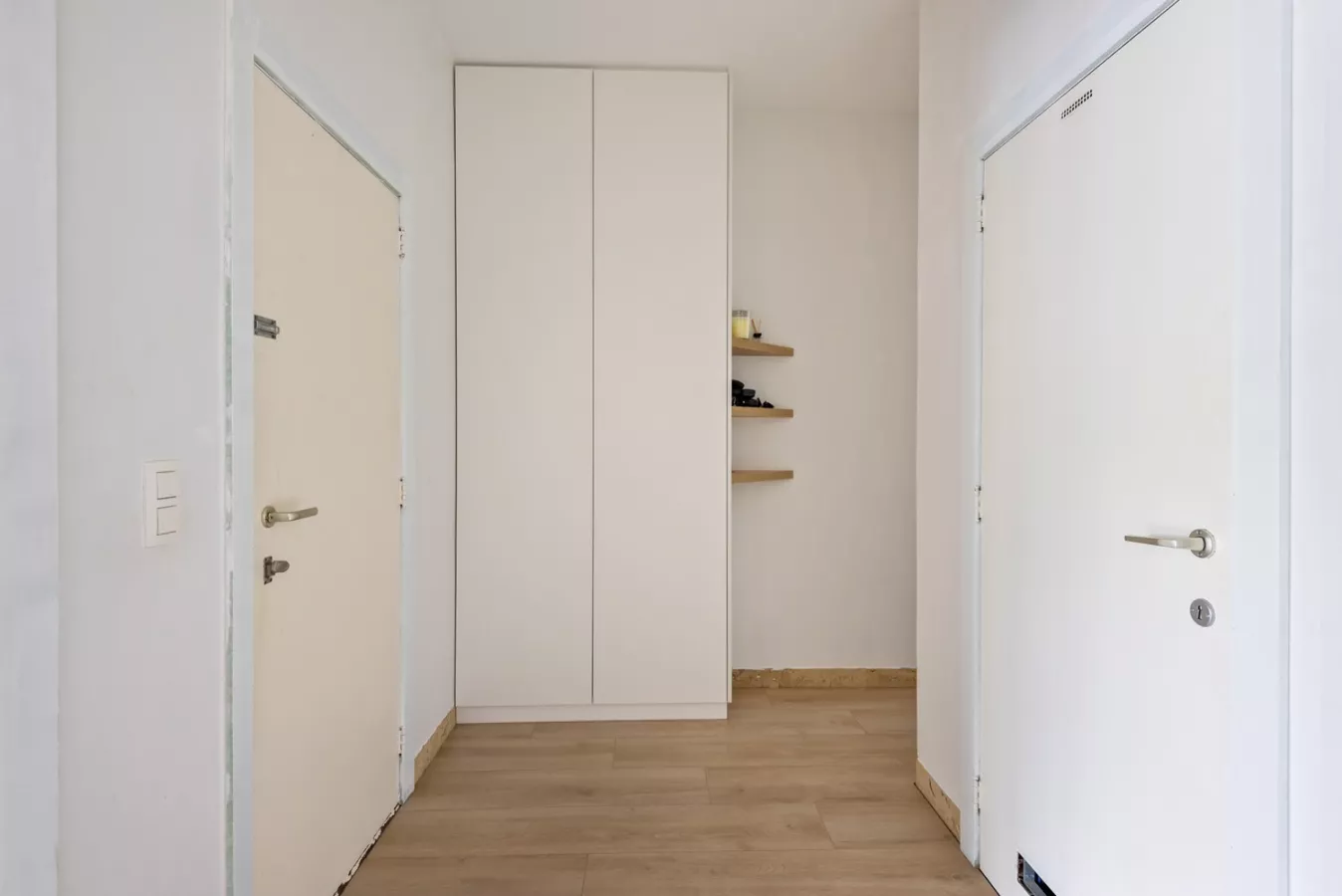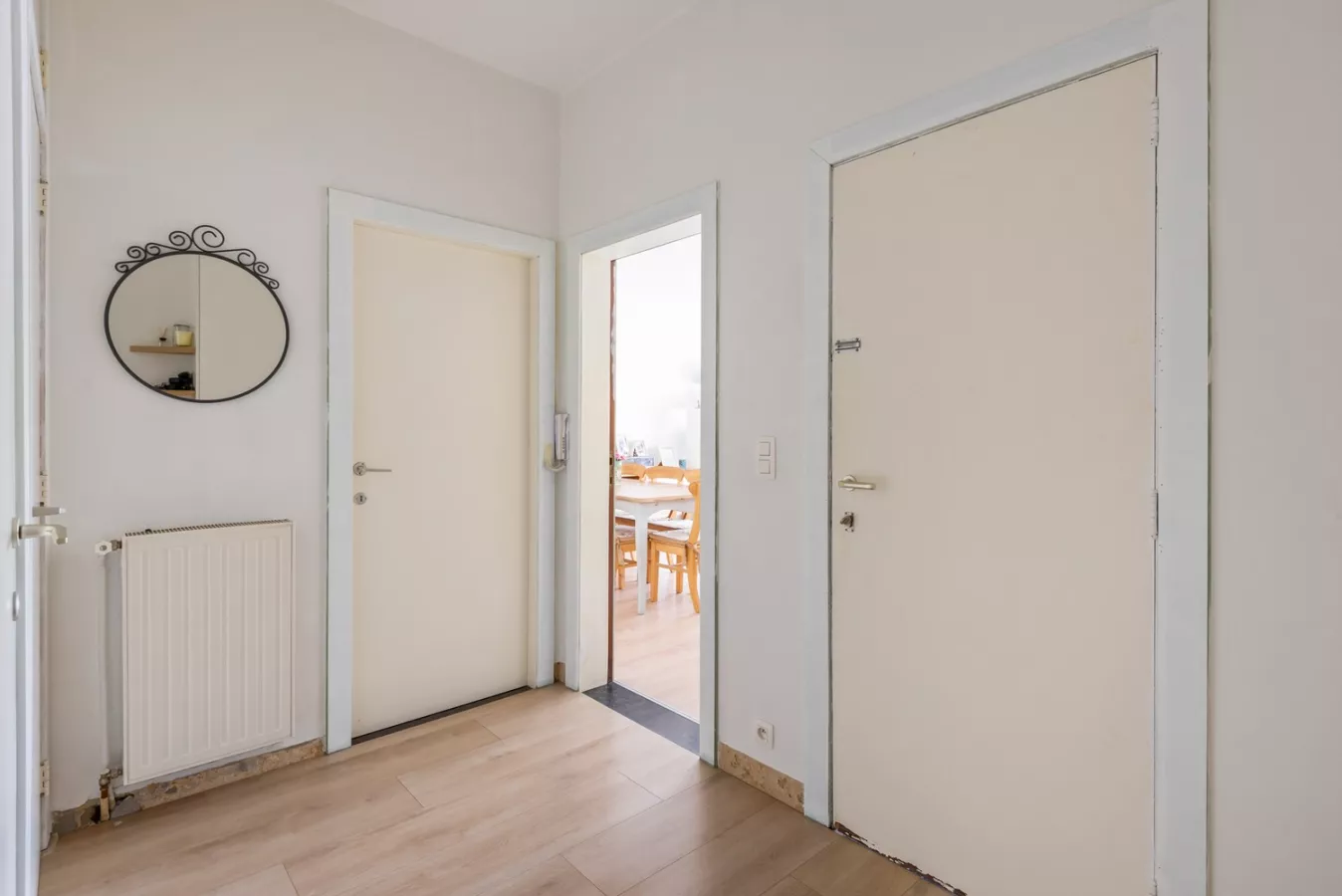 Bij het binnenkomen geeft de hal toegang tot de woonkamer, de keuken, de 2 slaapkamers en de badkamer.