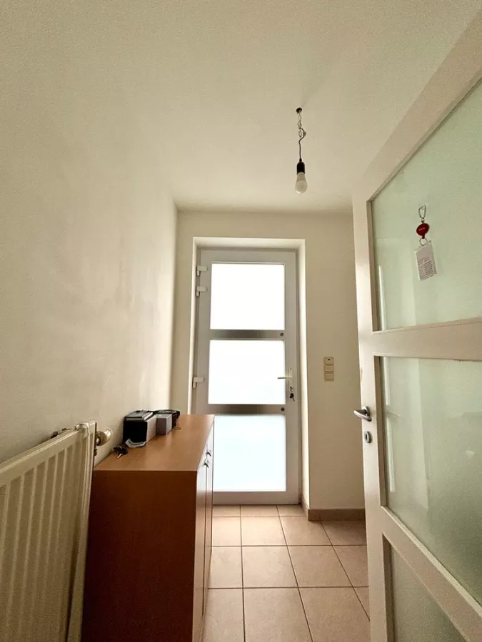 Bij het betreden van het appartement komen we in de privatieve inkomhal met apart gastentoilet. Vervolgens komt men in de leefruimte met volledig uitgeruste open keuken. Verder beschikt het appartement over een grote berging die extra opbergruimte én plaats voor wasmachine en droogkast biedt.