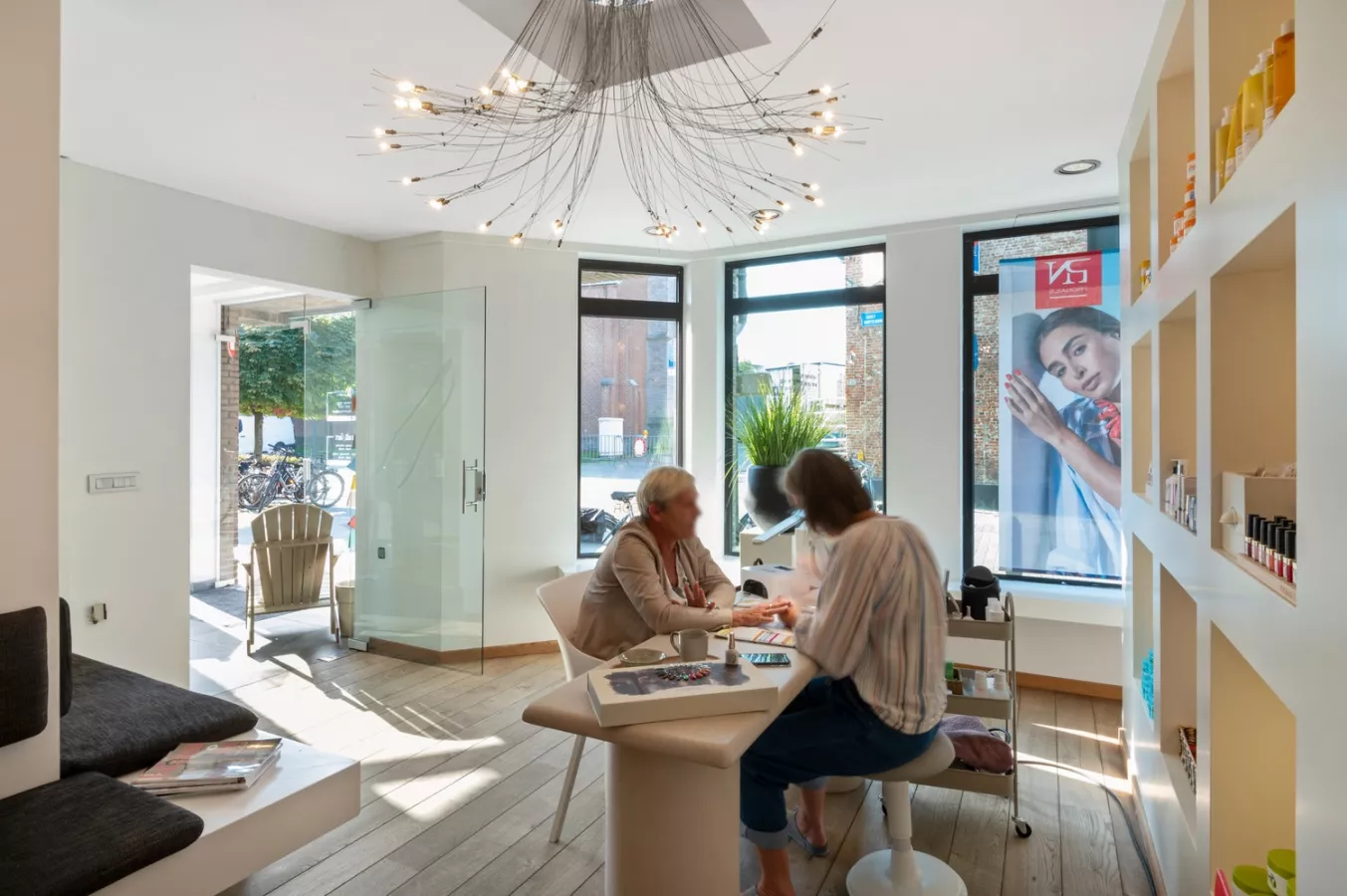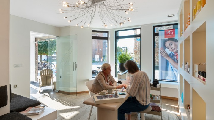 De linker ruimte is momenteel ingericht als nagelsalon. De ruimte bestaat uit een praktijkruimte gevolgd door een hal met toilet en helemaal achteraan een keuken en behandelruimte.