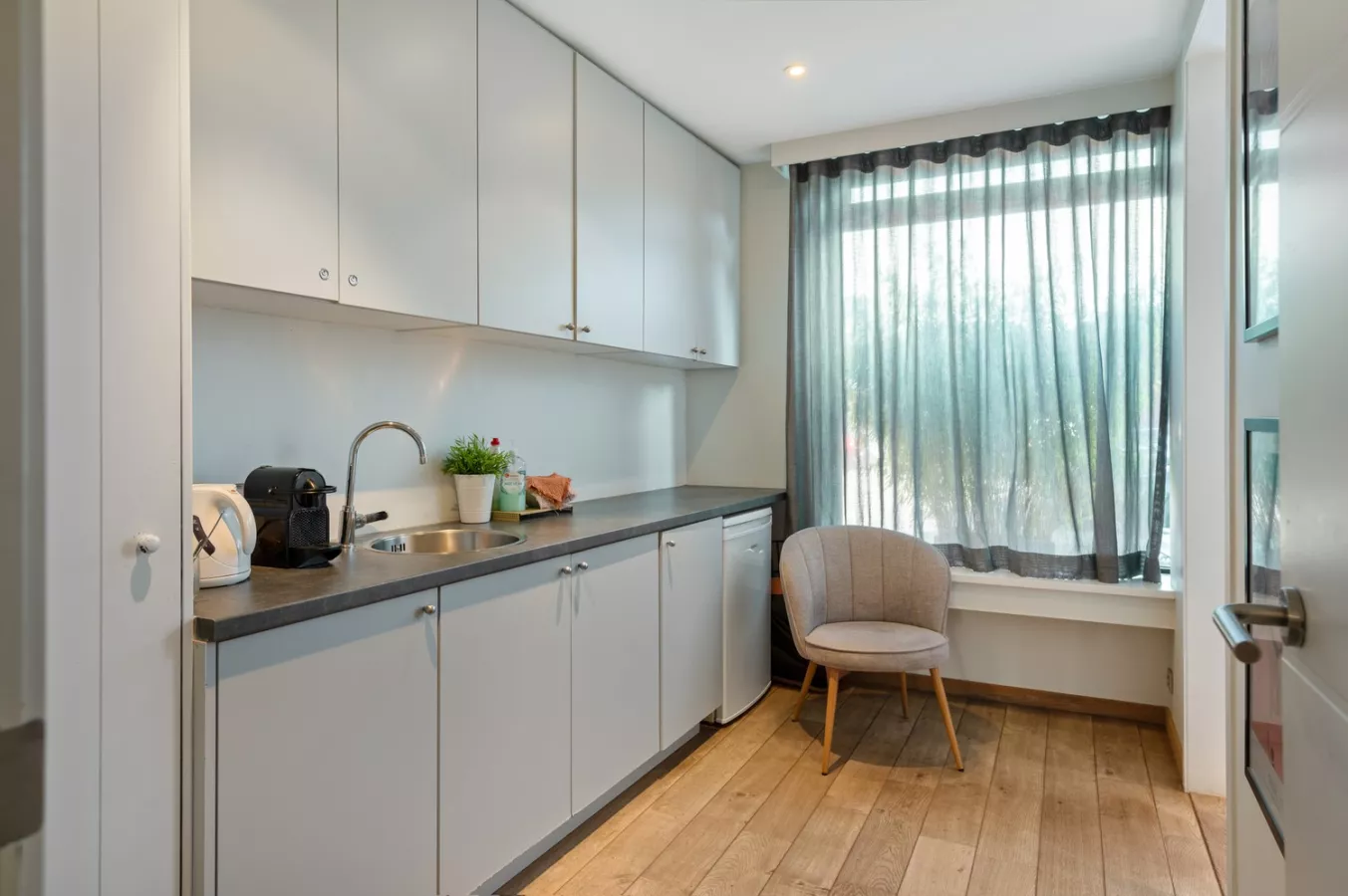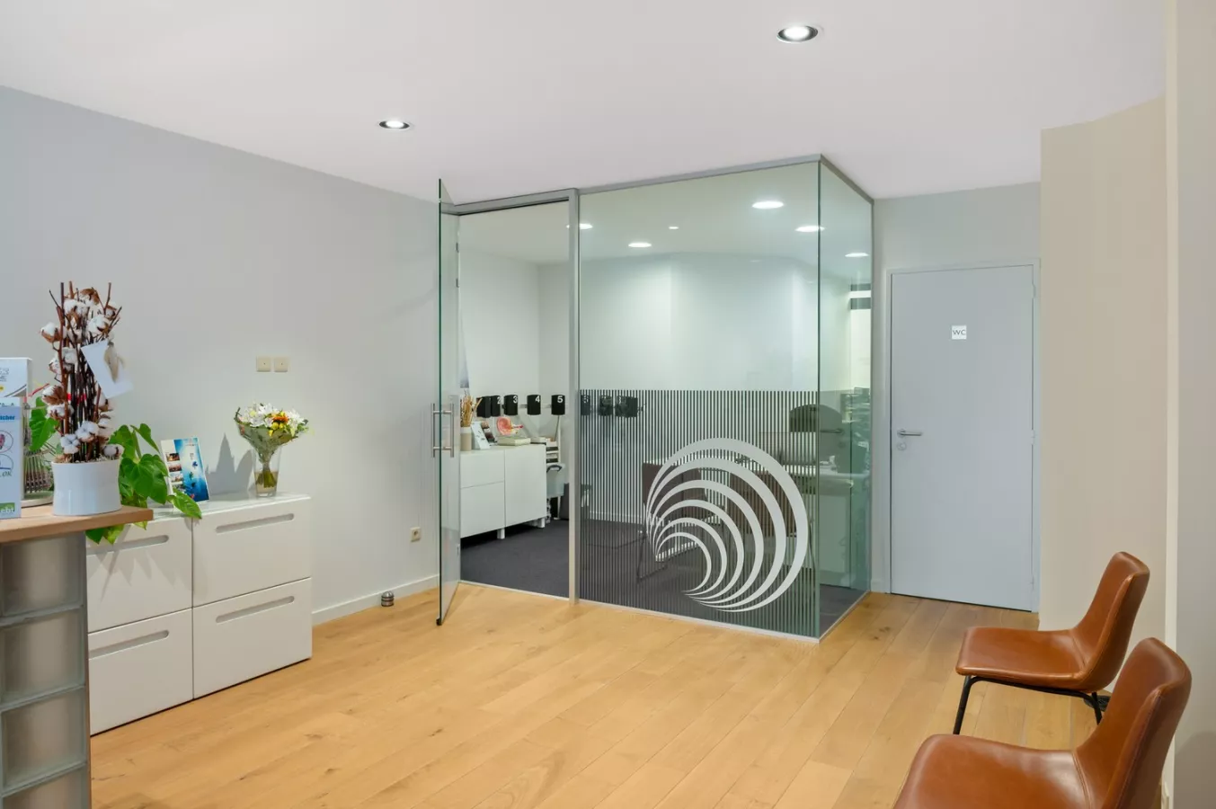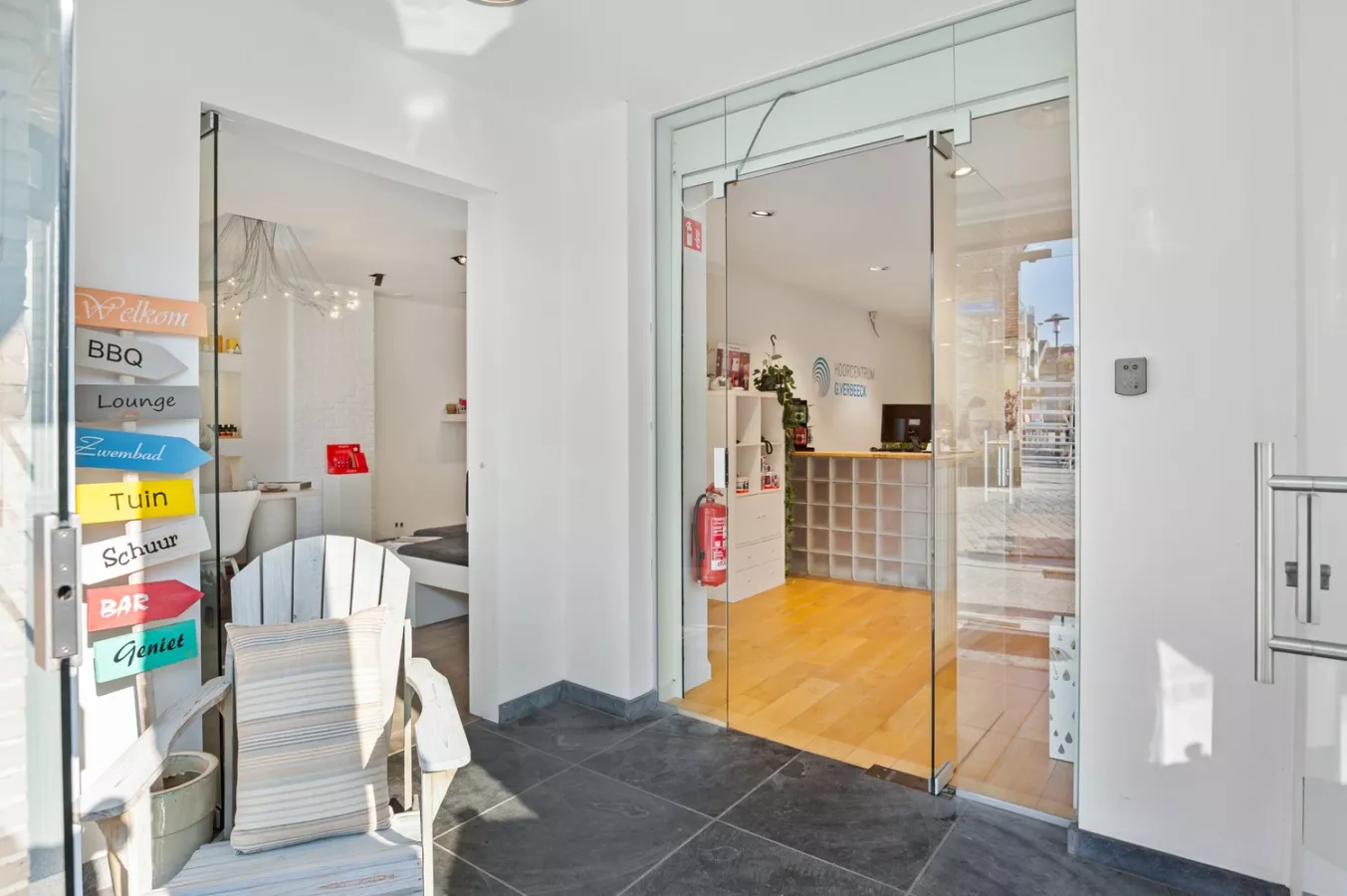 De rechter ruimte bestaat uit een onthaal met daarachter een bureau met kitchenette voorzien van een vaatwasser en een spoelbak met verlek. Naast het onthaal bevindt zich nog een toilet.