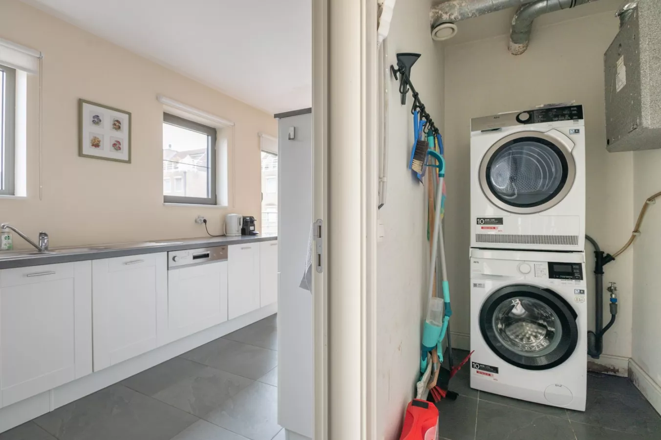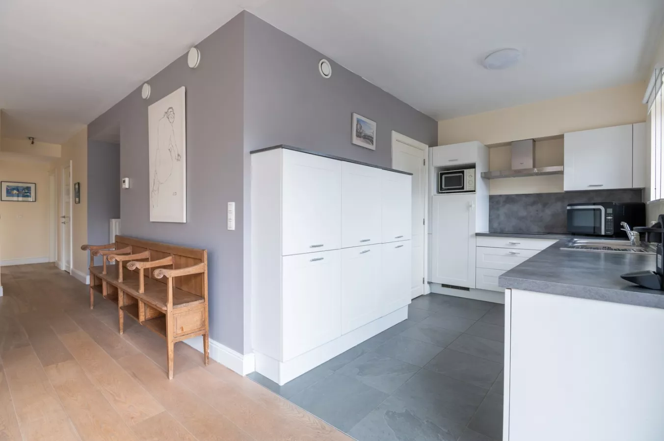 Wanneer we dit lichtvolle appartement op de eerste verdieping betreden, komen we binnen via de inkomhal met apart toilet. De ruime leefruimte grenst aan een volledig geïnstalleerde kwalitatieve open keuken met aangrenzend een ruime wasberging. De keuken is voorzien van een dubbele spoelbak, koelkast, vaatwasser, keramische kookplaat met elektrische dampkap.
