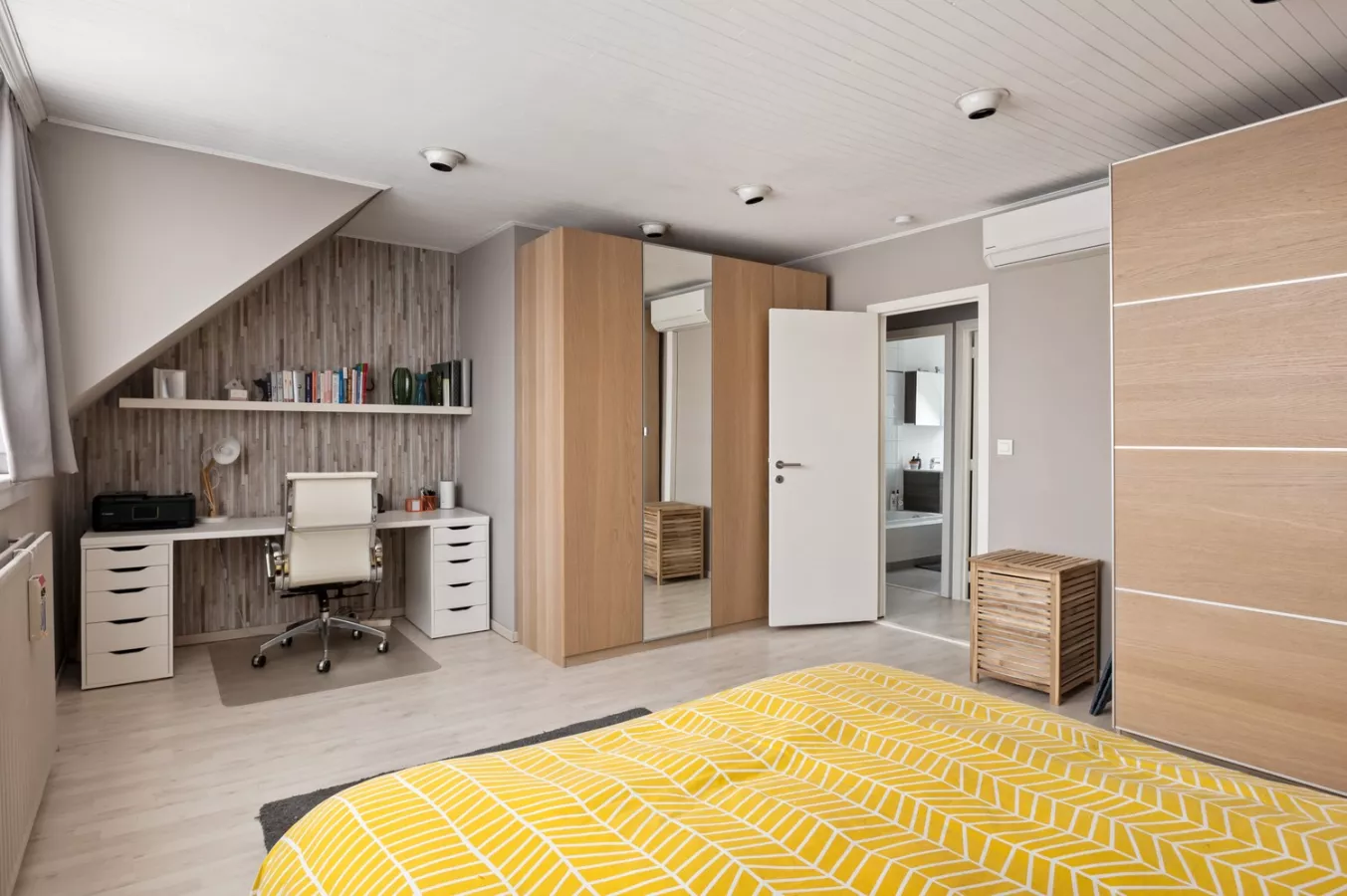 Op de bovenste verdieping vinden we nog een zeer ruime derde slaapkamer terug (26.5²) met ingebouwde kasten en airco.