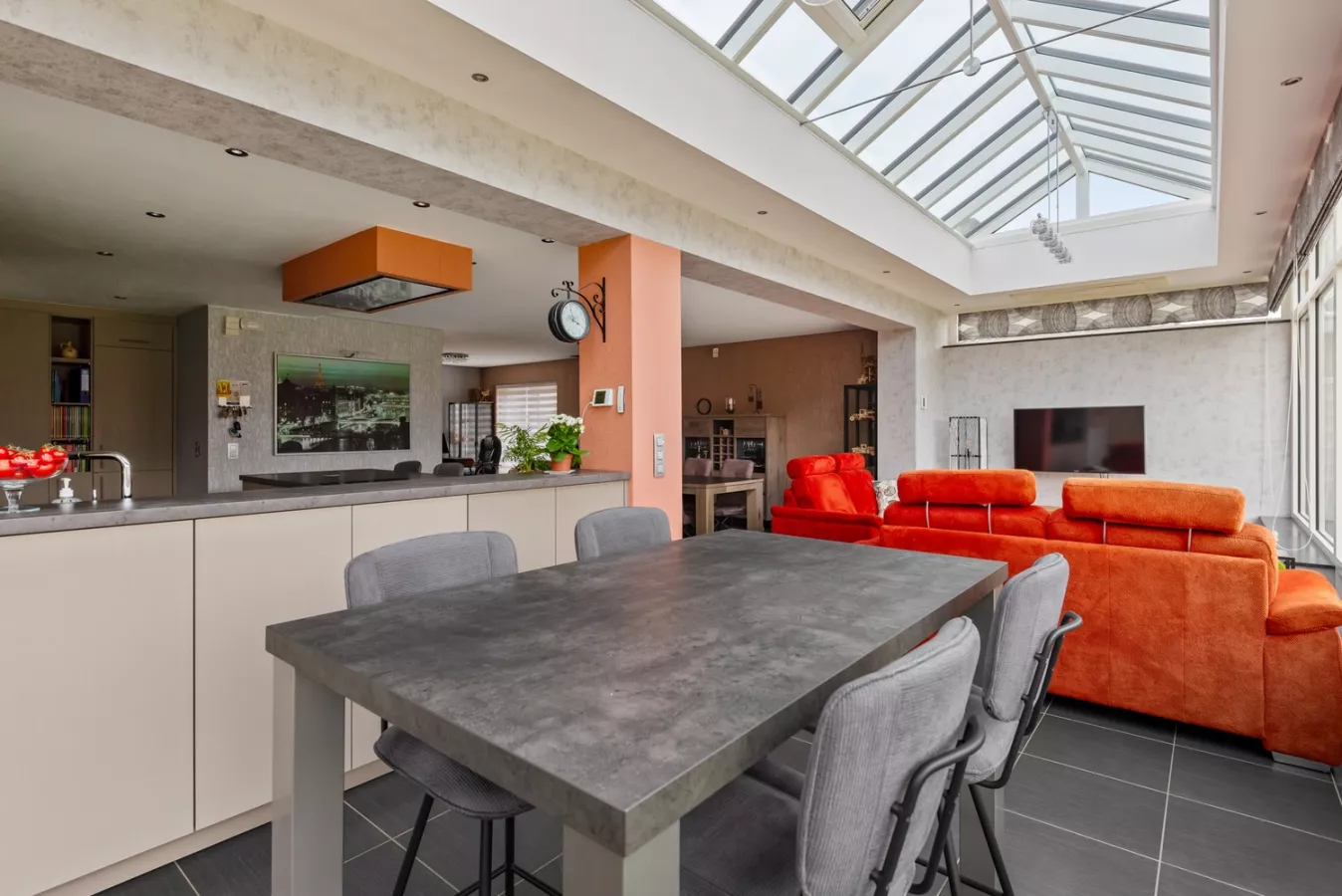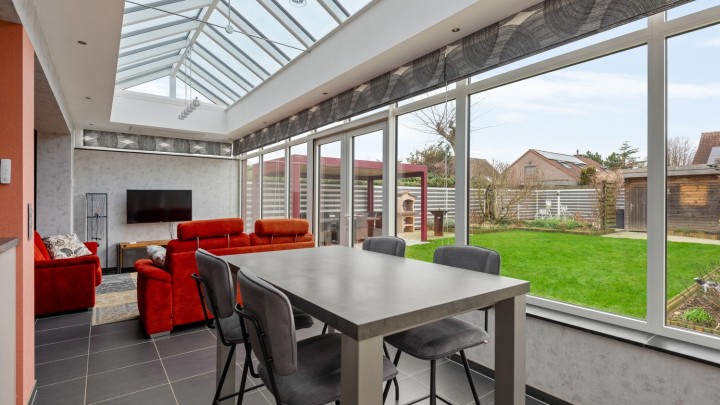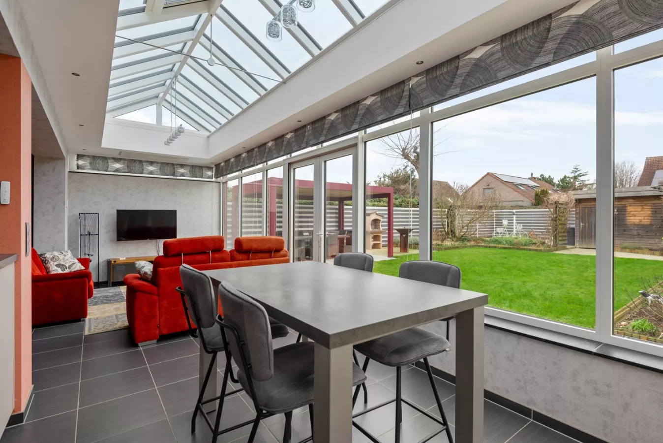 De leefveranda is zowat de lijm tussen de woonkamer, de keuken en de toffe tuin. Het baadt er van het licht en hier waan je je buiten het hele jaar door.