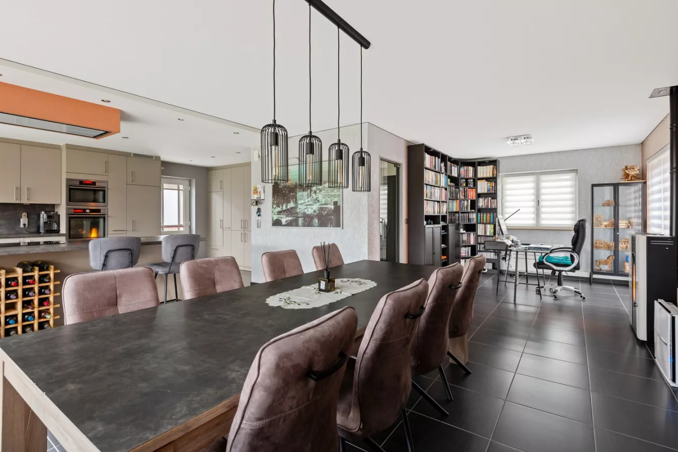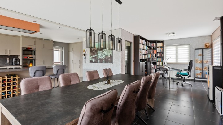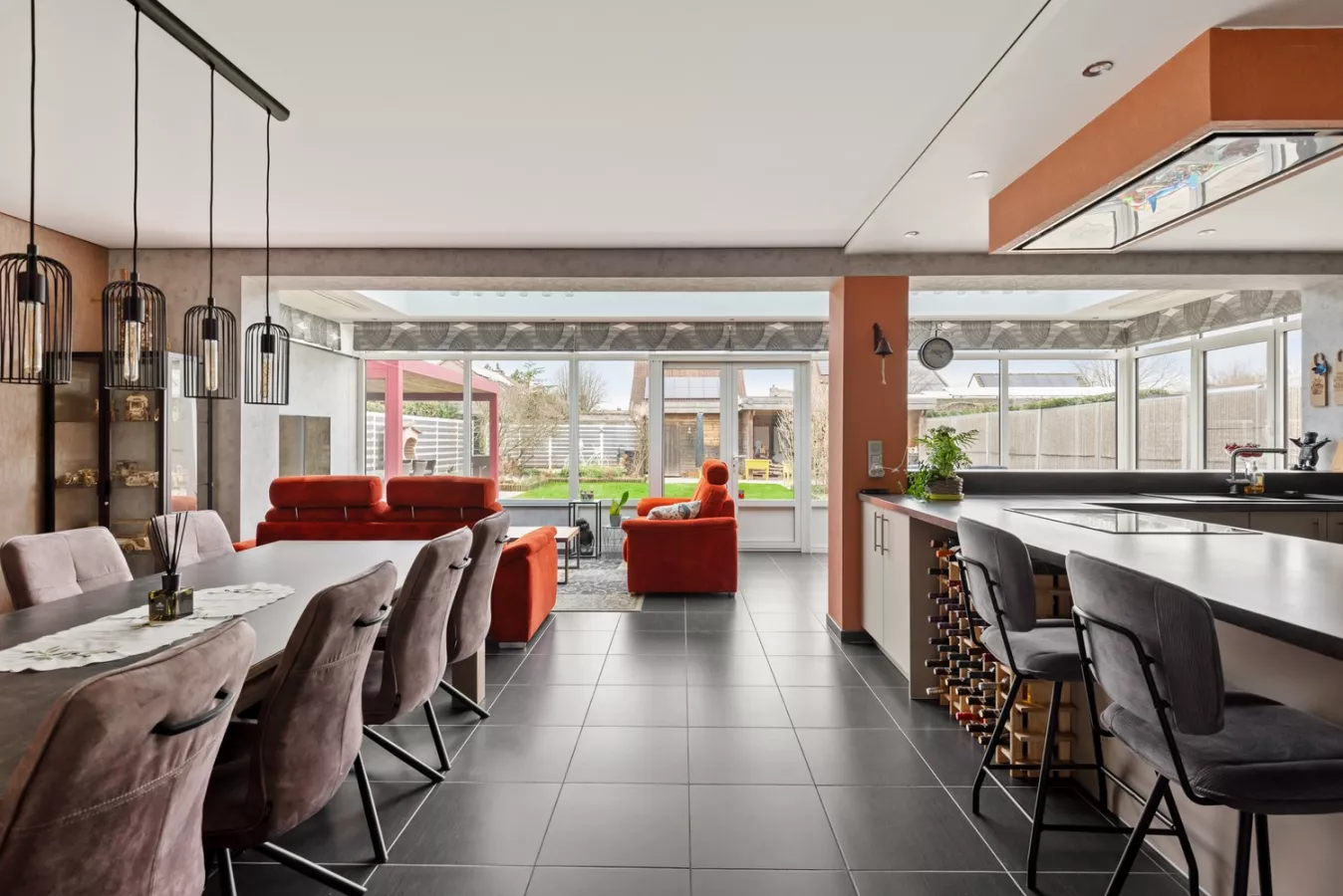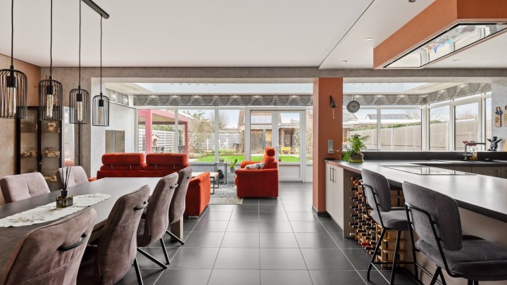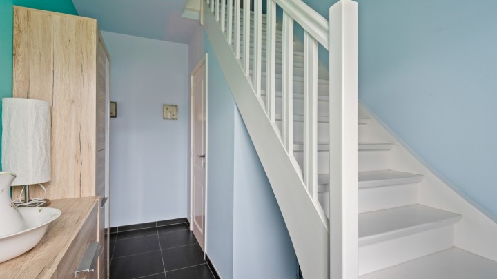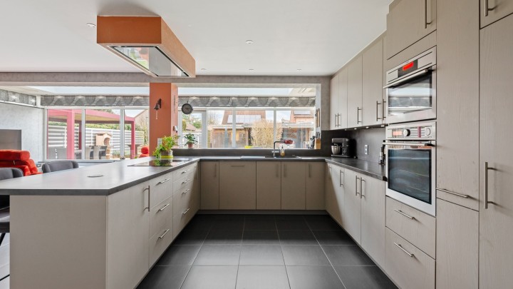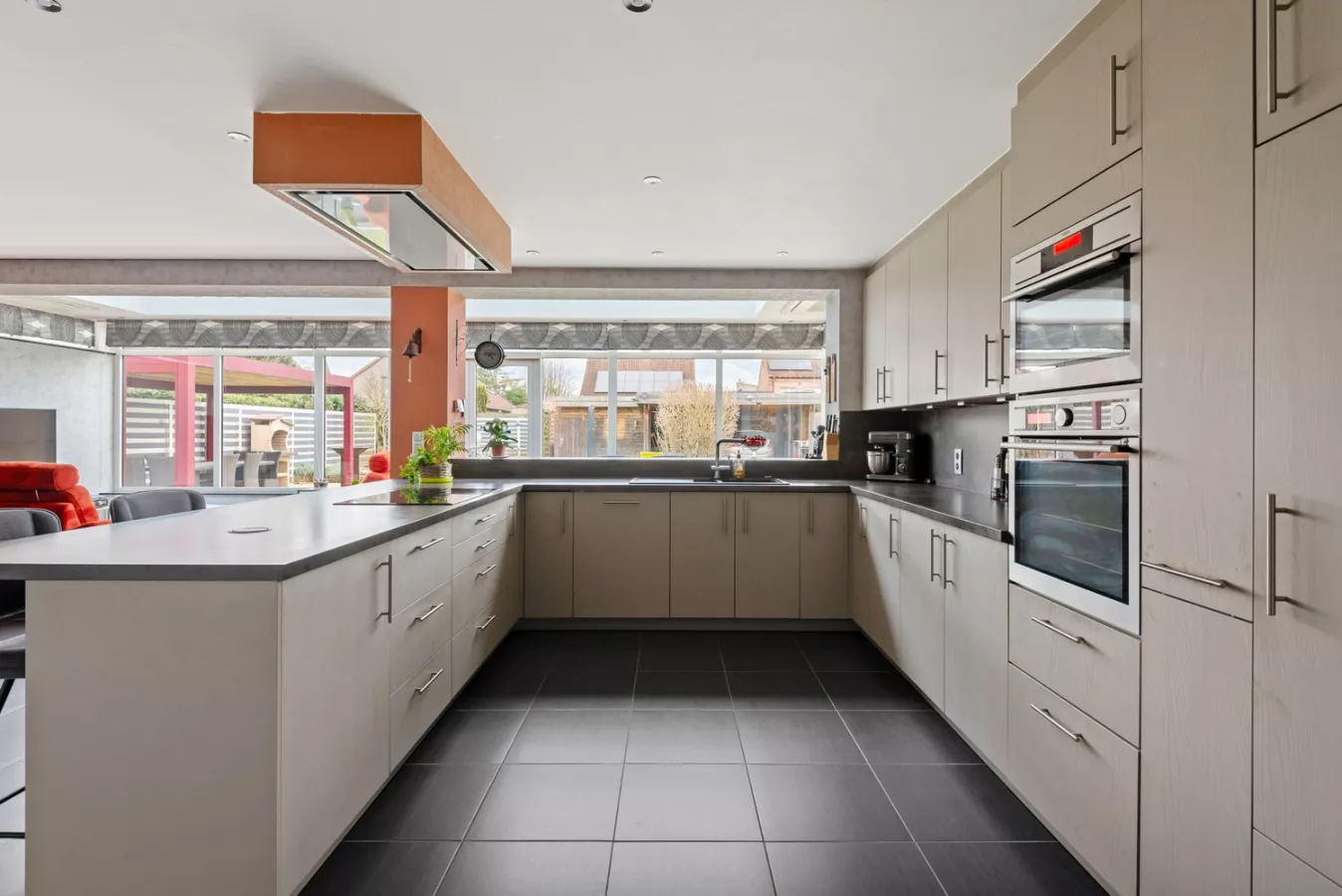 U betreedt de mooi gerenoveerde woning via een brede inkomhal met gastentoilet. Deze brengt u meteen naar de ruime en lichtrijke leefruimte met centraal de royale open keuken. Ze is tot in de puntjes vernieuwd en optimaal ontworpen. Dankzij het prachtige uitzicht op de mooie tuin is het een waar plezier om hier de lekkerste gerechten te creëren. Deze keuken is als het ware het hart van de woning. Aansluitend treffen we tevens een praktische verborgen berging met op maat gemaakt schrijnwerk en een aansluiting voor de wasmachine.