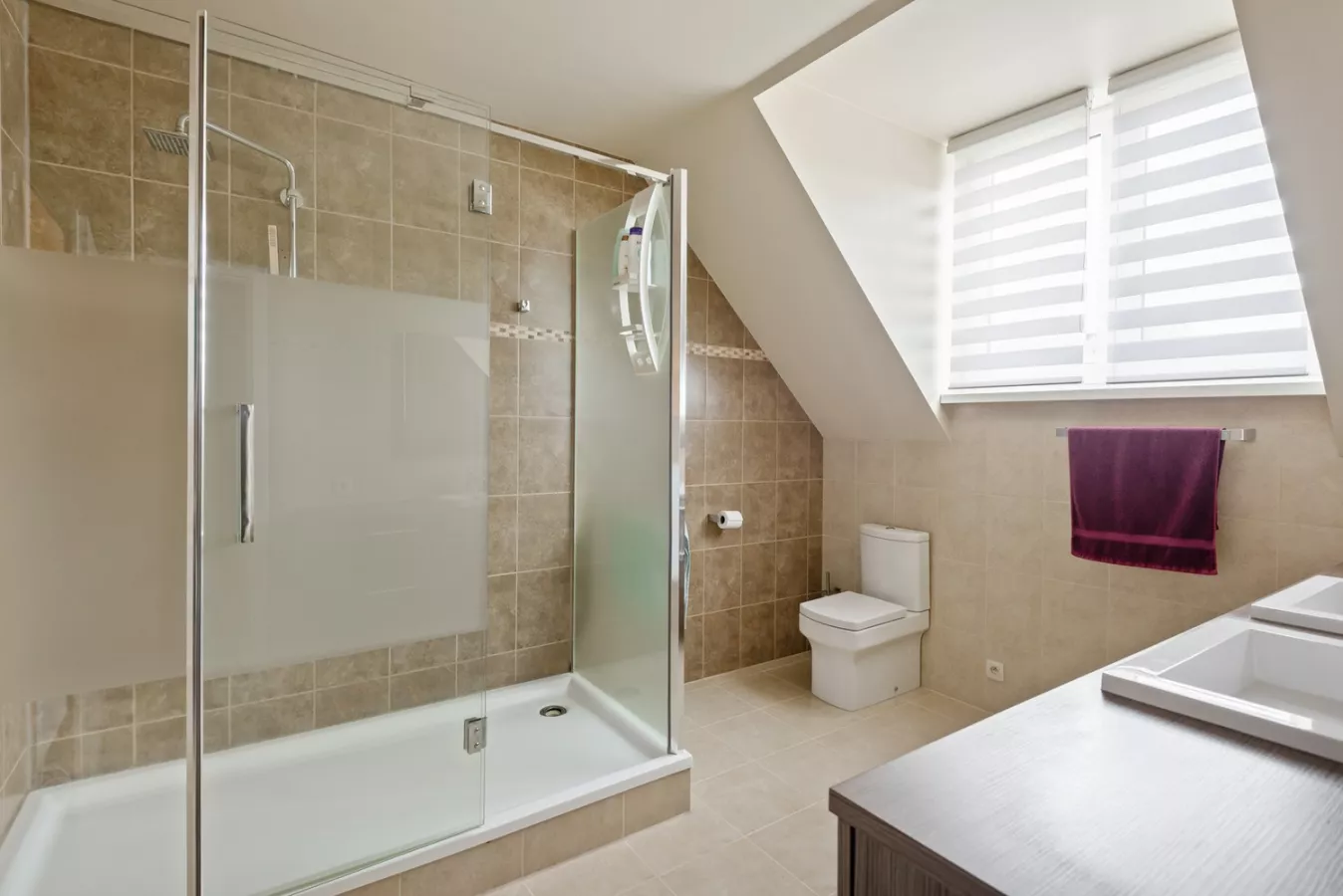 Op de eerste verdieping van deze woning vinden we 3 ruime slaapkamers ( 11m²/13m²/15m² ) alsook een stijlvolle badkamer voorzien van een dubbele lavabomeubel, een wc en een grote douche. De combinatie van de kleurtinten met het lichtinval zorgt voor een aangename warme sfeer.