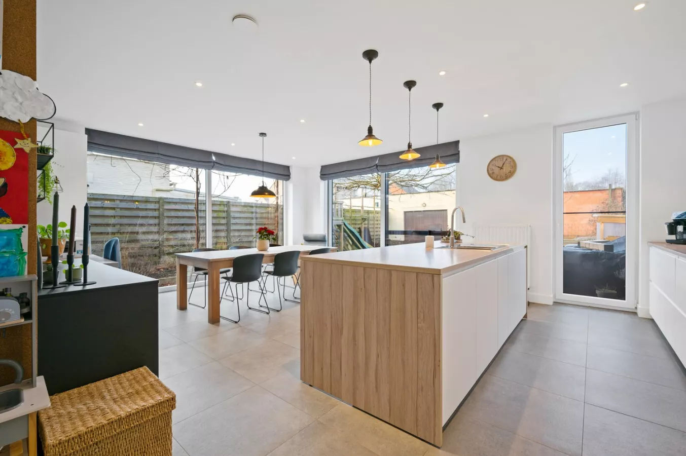 Grenzend aan de leefruimte bevindt zich de ruime eetplaats en de volledig uitgeruste keuken. De keuken is volledig geïnstalleerd en voorzien van een vaatwasser, een inductiekookplaat, microgolf, ijskast, diepvries en oven. De raampartijen rondom zorgen voor veel lichtinval en bieden een mooi zicht op de tuin.