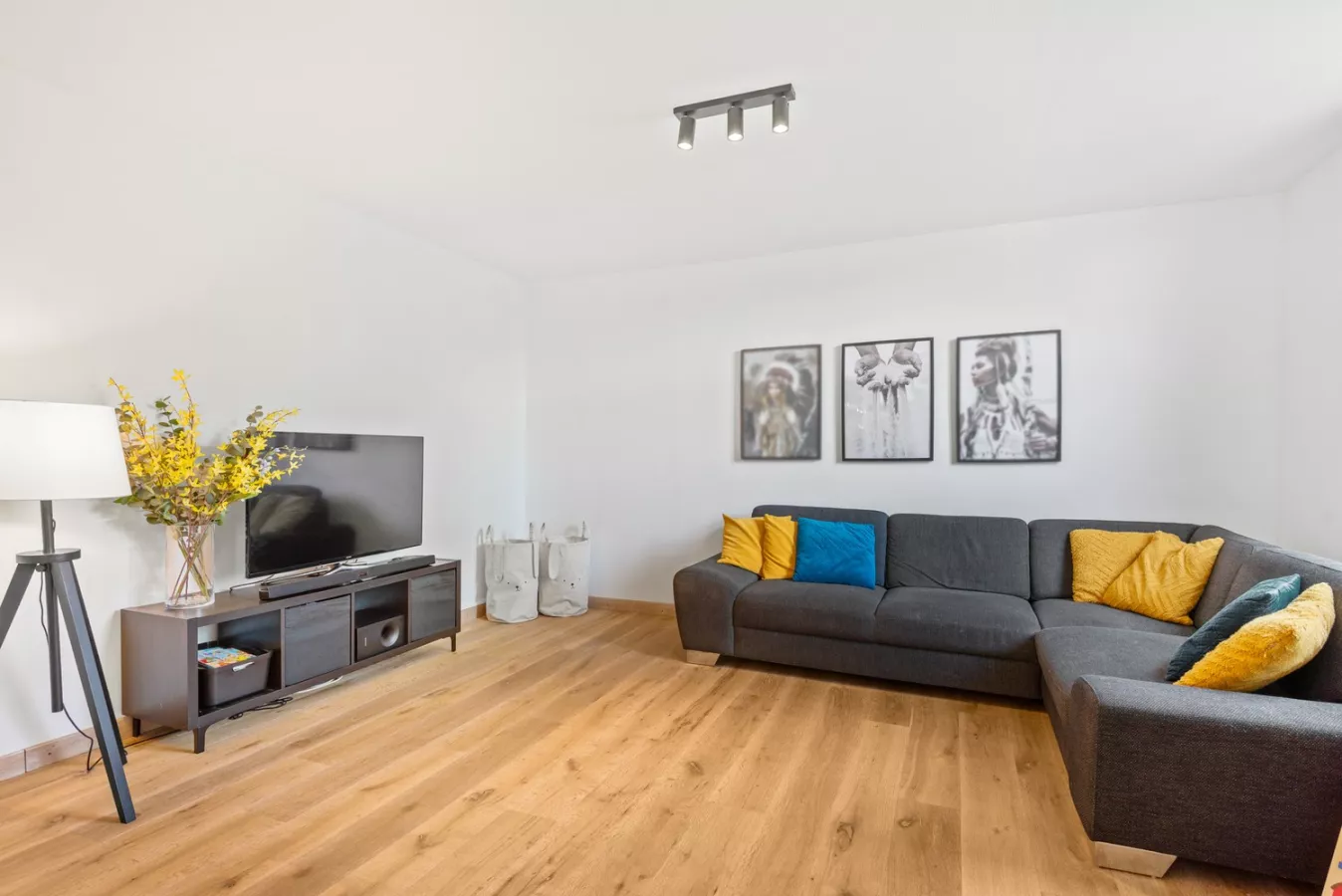 De woning beschikt over een inkomhal met vestiaire die toegang biedt tot de woonruimte. Deze gezellige woonkamer grenst aan de open keuken, die dankzij de vele ramen een aangename lichtinval heeft.