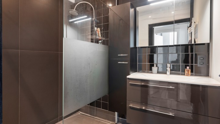 Tenslotte vindt u een moderne badkamer met inloopdouche, lavabomeubel en spiegelkast terug. Er is eveneens een apart toilet.