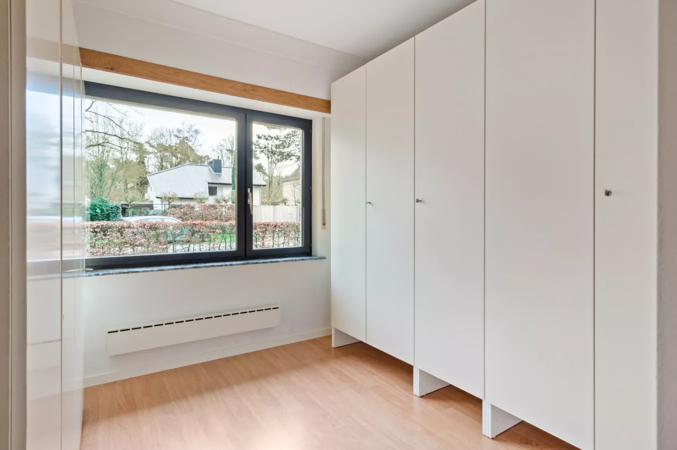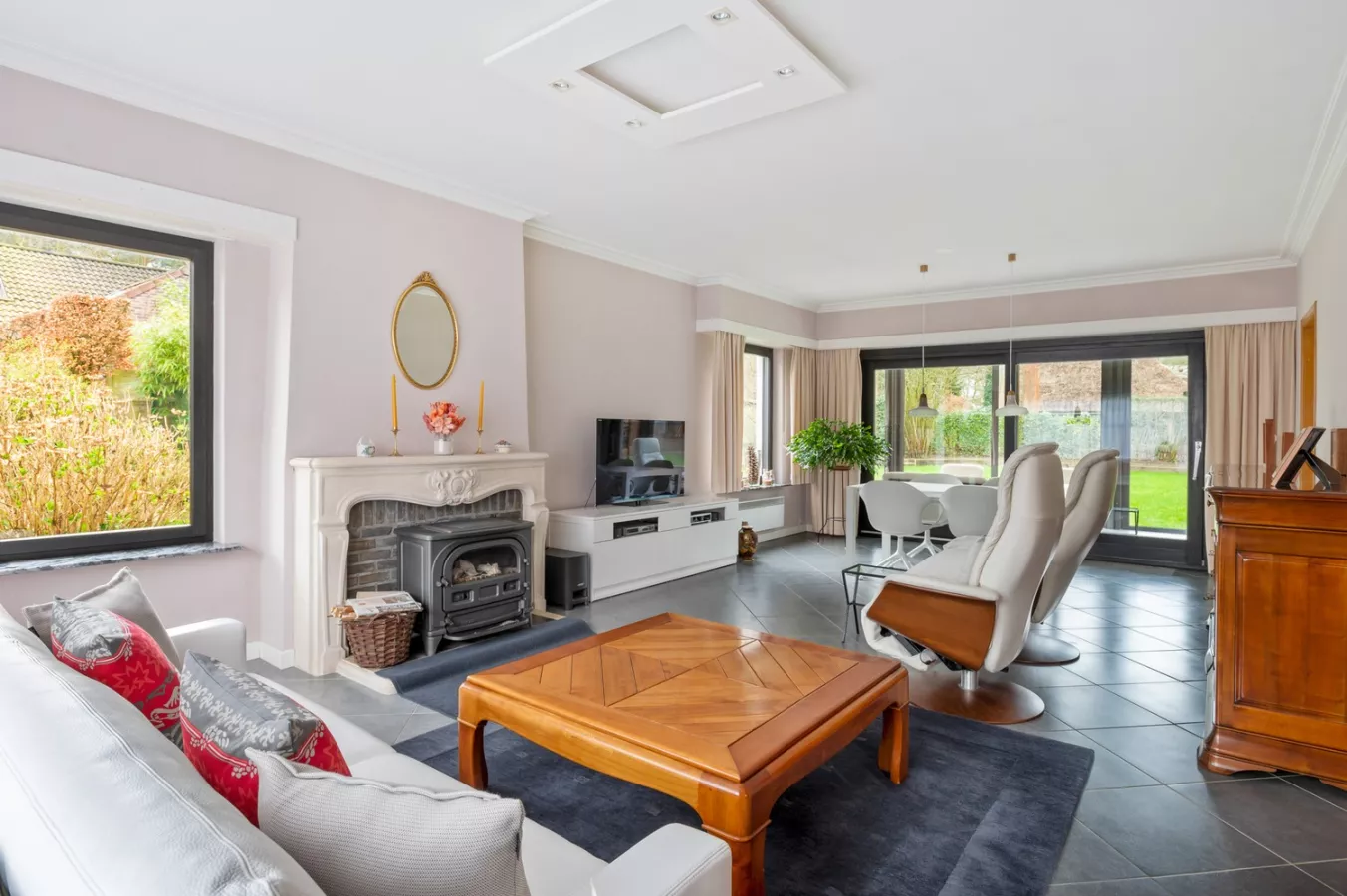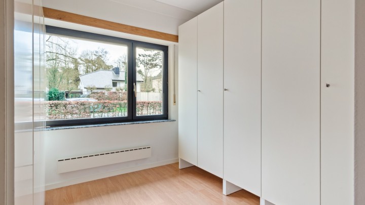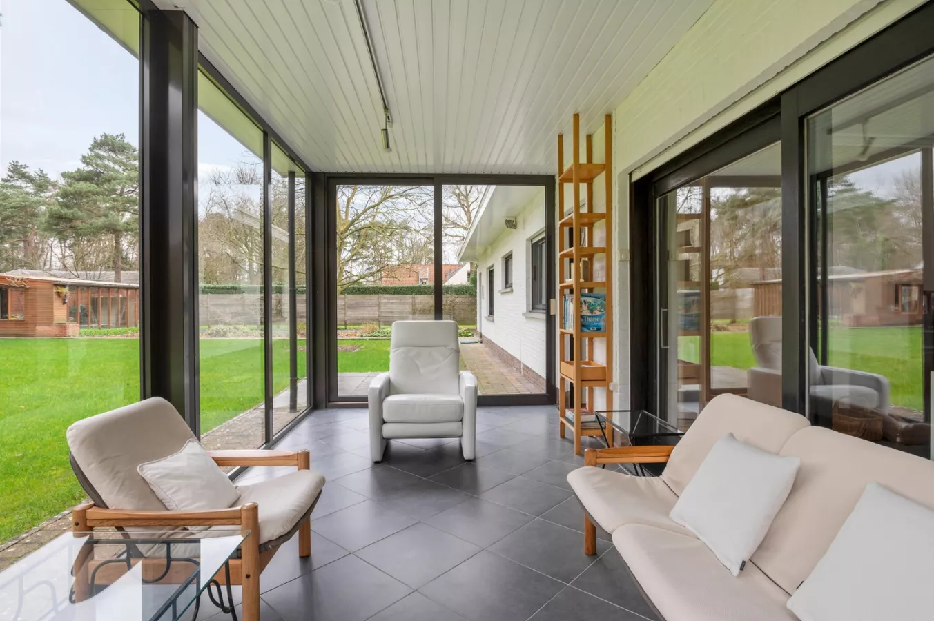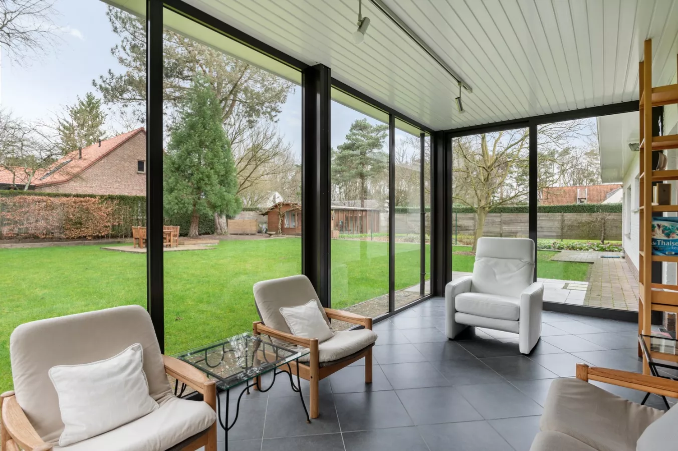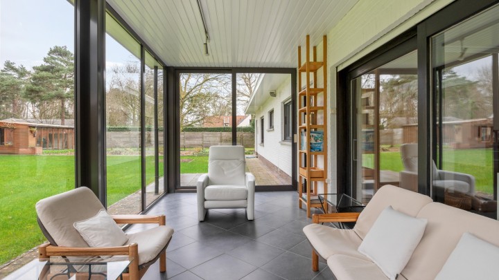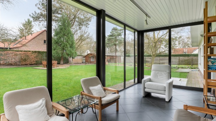 De vele raampartijen zorgen voor een aangename en natuurlijke lichtinval. Via de grote schuifraam achteraan heeft u toegang tot de gezellige veranda.